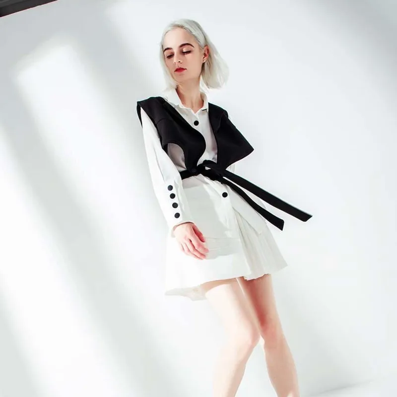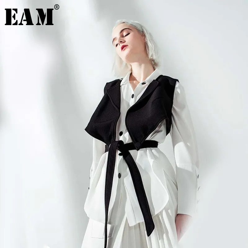 Special Offer [EAM] 2020 nuevo Otoño Invierno solapa de manga larga chaleco negro Stitch cinta suelta camisa de dos piezas mujer blusa moda marea JO664 Discount 17% Today!