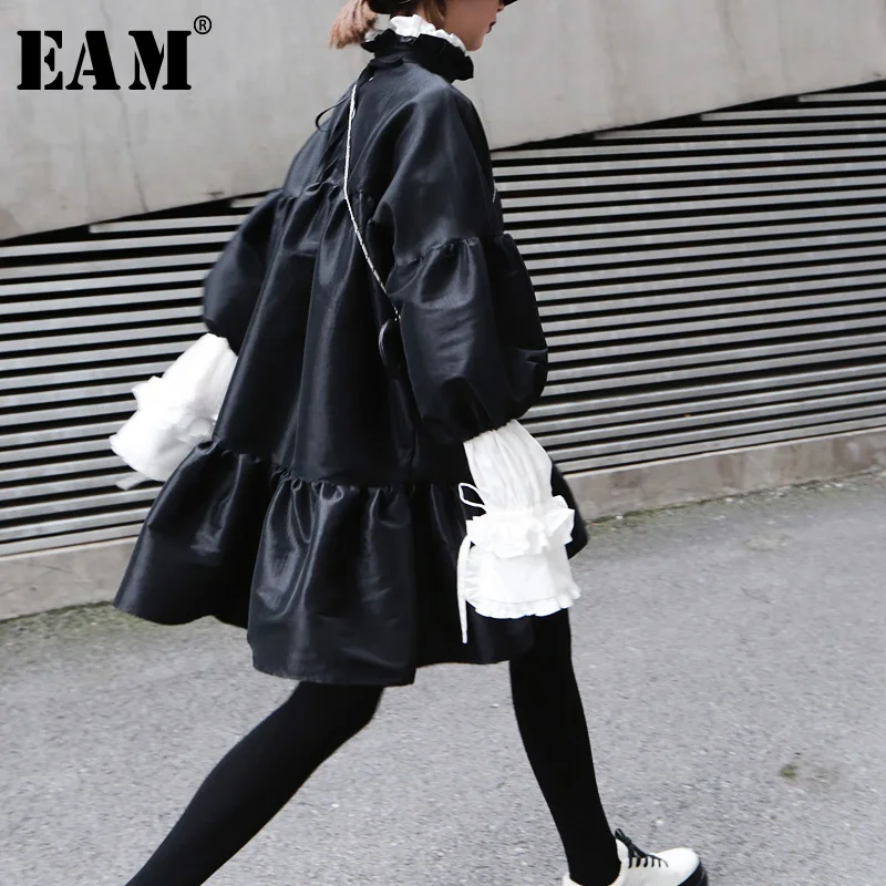 Special Offer [EAM] 2020 nuevo Primavera Verano cuello alto manga larga Puff negro suelto Hem Ruffels Stitch vestido suelto mujer moda marea JK852 Discount 17% Today!