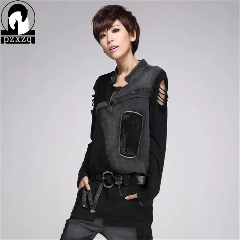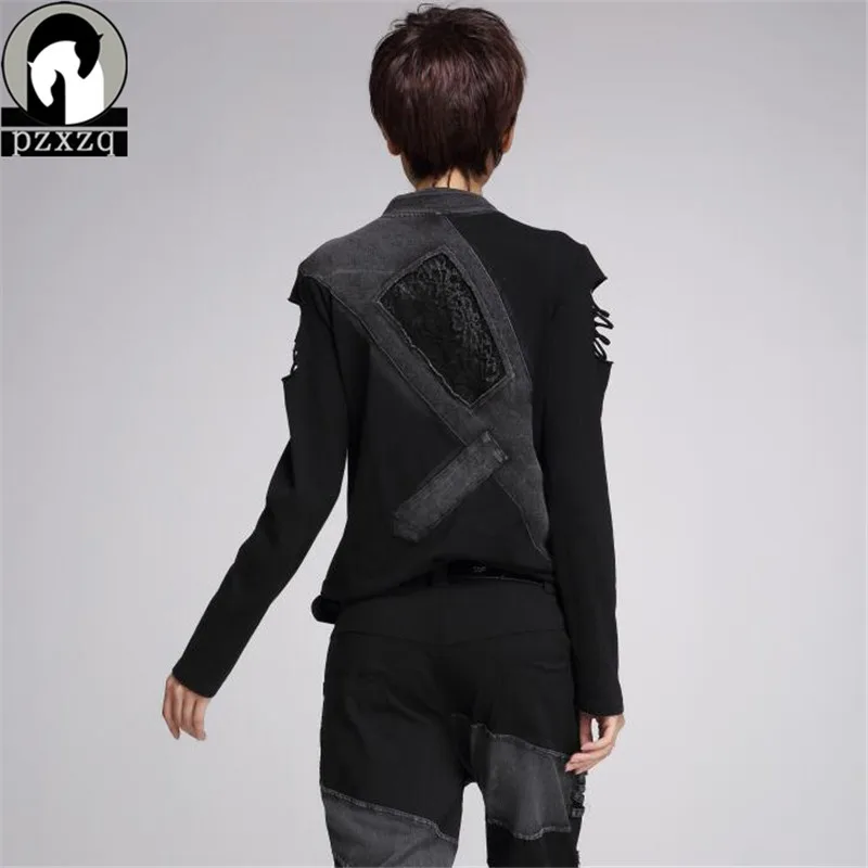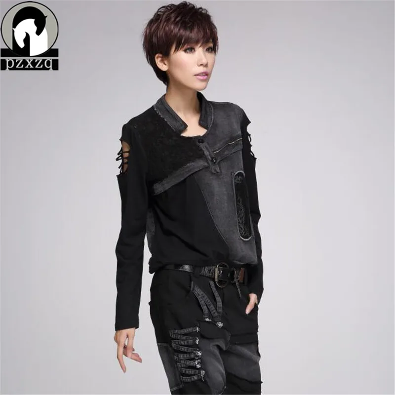 Special Offer Camiseta de manga larga sin tirantes de moda callejera para mujer ropa negra de talla grande Perfurado Mulheres Camiseta Discount 20% Today!