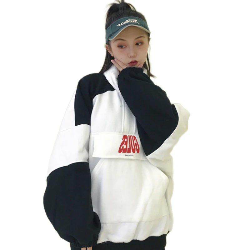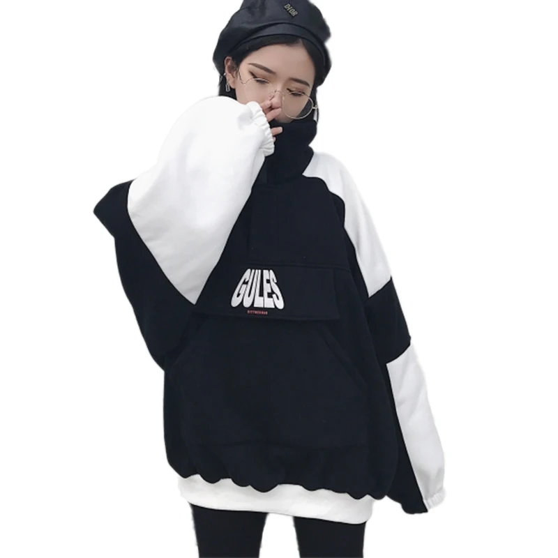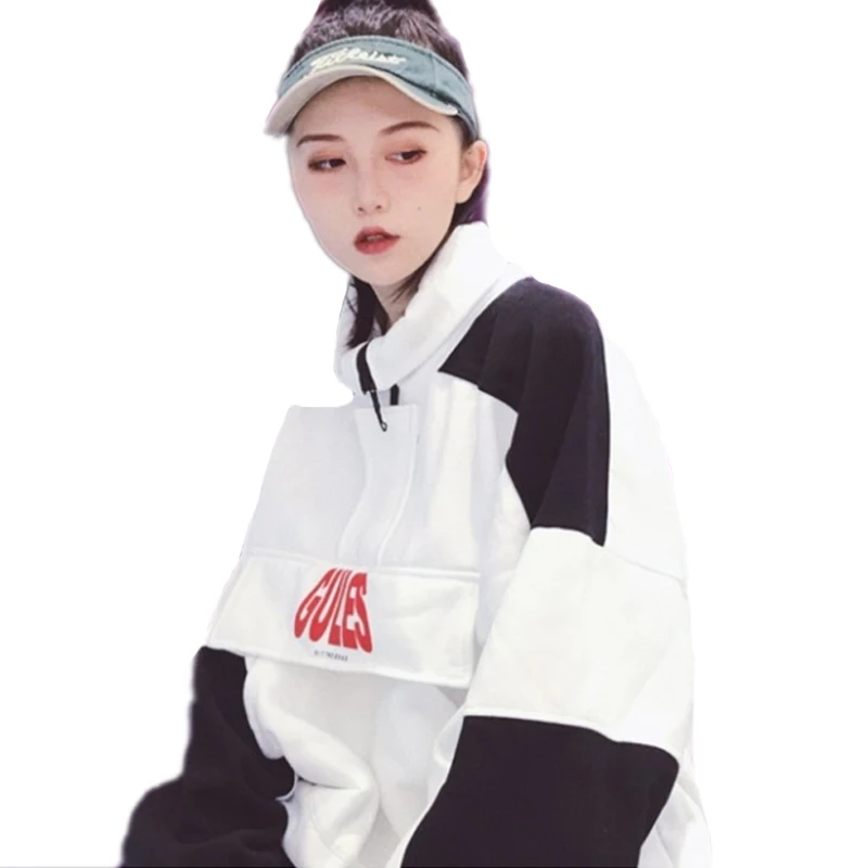 Special Offer 2018 Otoño e Invierno par cremallera suelta más terciopelo negro y blanco costura Harajuku alto cuello manga larga sudaderas Discount 30% Today!