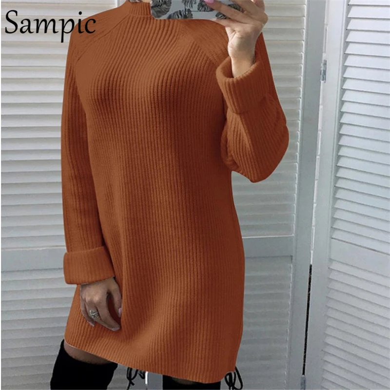 Special Offer Sampic sólido negro gris marrón de punto de manga larga suéter vestido de cuello alto túnica suelta casual vestidos de invierno de talla grande Discount 40% Today!