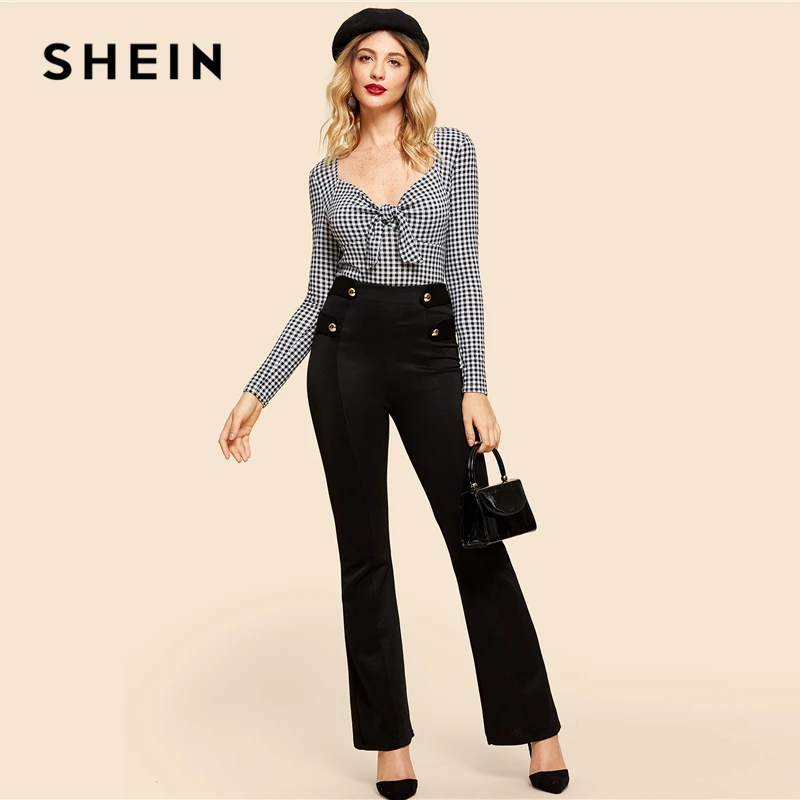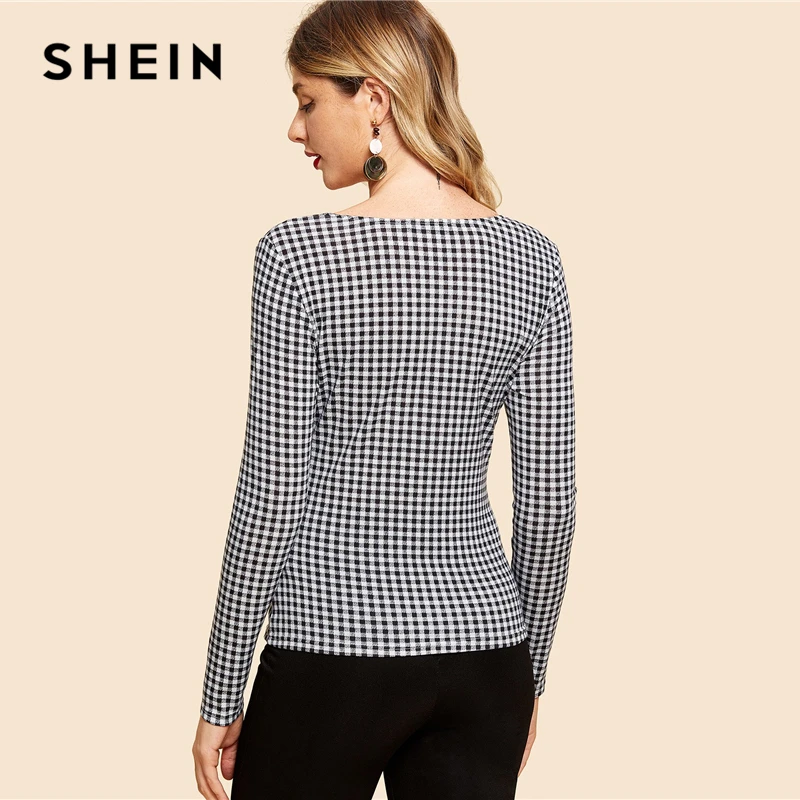 Special Offer SHEIN blanco y negro nudo frente guingán impreso Tee Vintage manga larga cuello en V Delgado ajuste Camisetas Mujer elegante otoño camiseta Discount 41% Today!