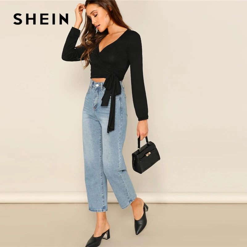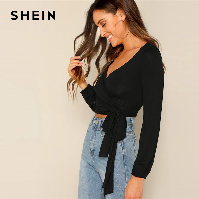 Special Offer SHEIN Highstreet Black Surplice Wrap Knot Crop Plain Delgado ajuste Tee 2019 primavera glamurosa mujeres cuello en V Camiseta de manga larga Discount 41% Today!