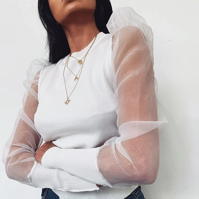 Special Offer InstaHot negro blanco Patchwork blusa malla de manga larga cuello redondo Puff manga delgada elegante Casual señoras camisa otoño 2019 Discount 45% Today!