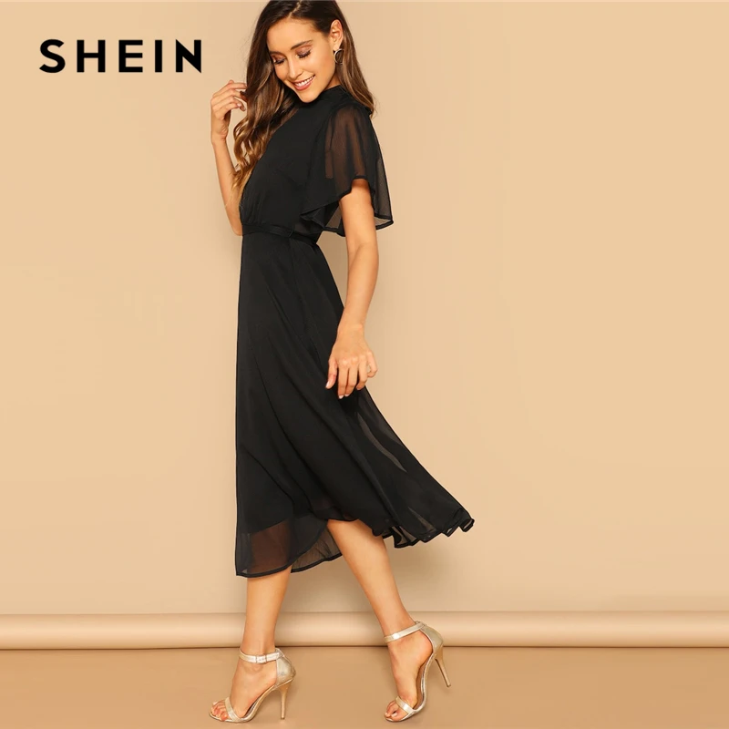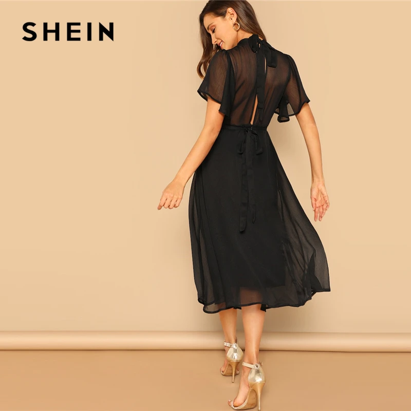 Special Offer SHEIN glamuroso negro Mock neck nudo espalda Sheer Panel vestido 2019 primavera una línea mariposa manga soporte cuello elegante vestidos Discount 46% Today!