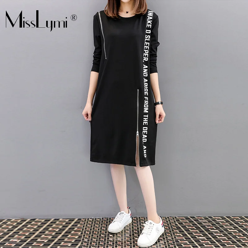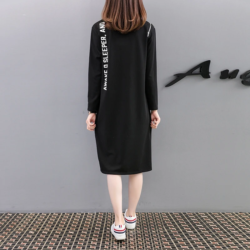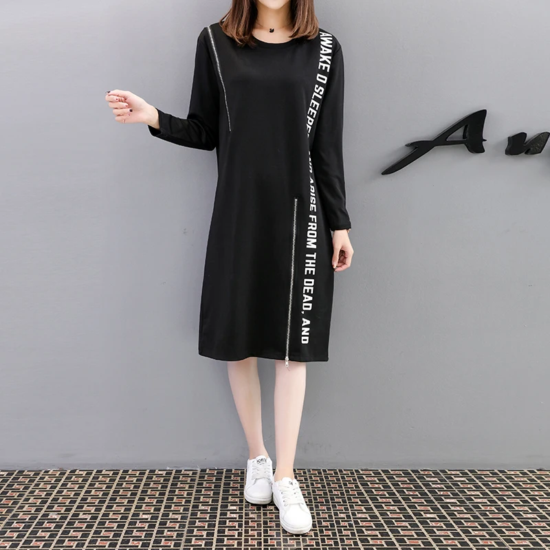 Special Offer XXXL 4XL de talla grande para mujer vestido camiseta negro primavera 2019 moda estampado de letras manga larga cremallera Patchwork suelto vestidos casuales Discount 25% Today!