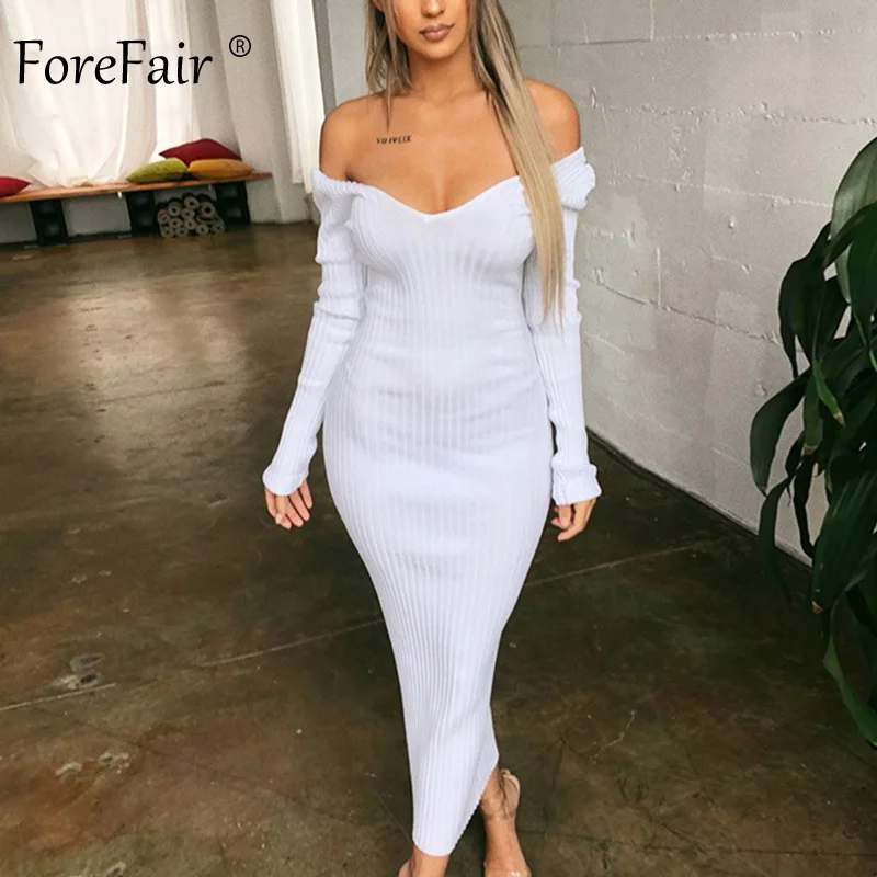 Special Offer Vestido Midi de punto Forefair para mujer otoño 2019 cuello en V básico ajustado acanalado manga larga ajustado negro blanco Sexy vestido de invierno Discount 30% Today!