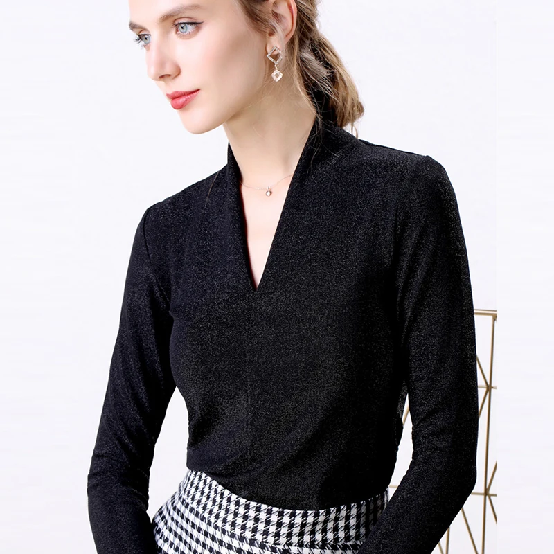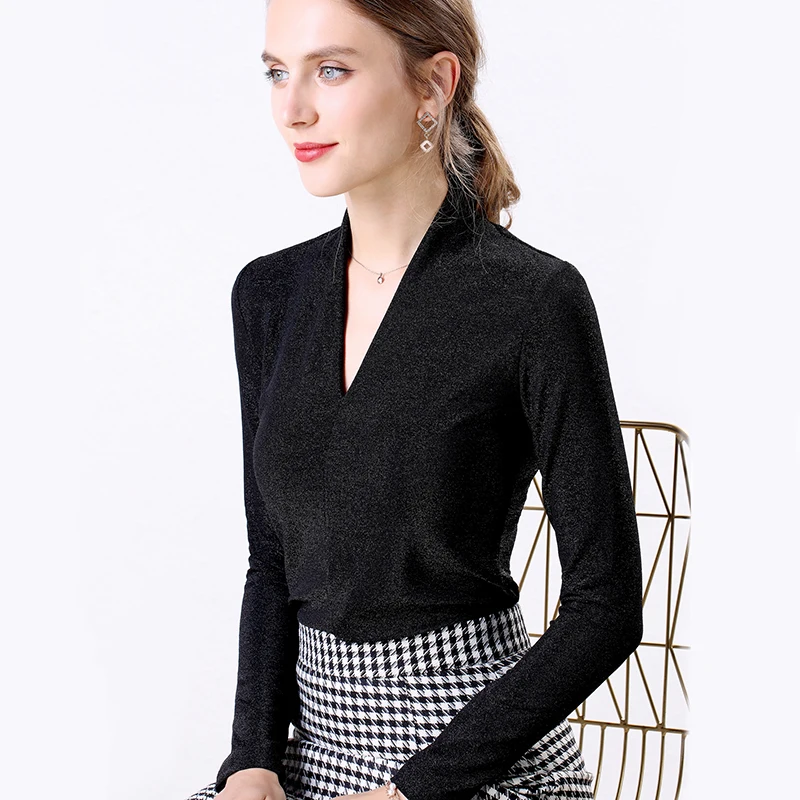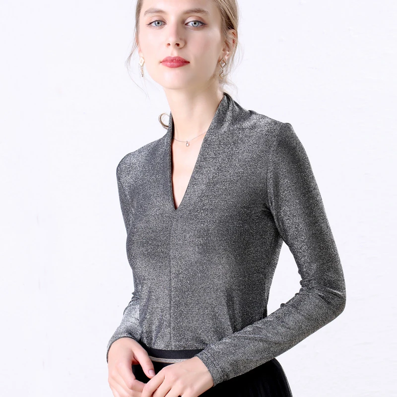 Special Offer Otoño Invierno 2019 cuello en V Sexy manga larga brillante Lurex blusas Mujer 2019 moda Tops blusa elegante mujer Camisetas talla grande negro Discount 40% Today!