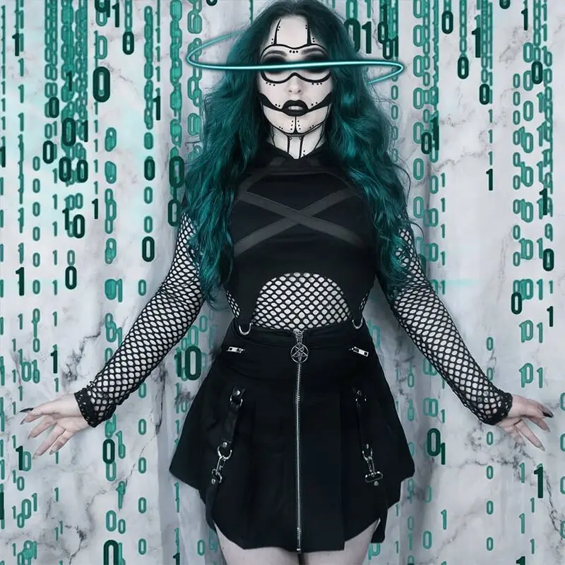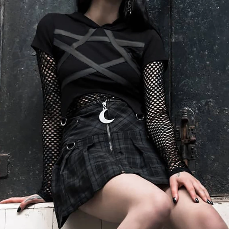 Special Offer Camisetas góticas de mujer negras con estampado de pentagrama de malla de manga larga Sexy ahuecadas para mujer Camisetas de moda ropa de calle Discount 45% Today!
