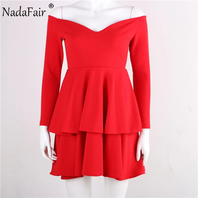 Special Offer Nadafair negro blanco rojo vestidos de fiesta Otoño Invierno manga larga línea A elegante Mini volantes de hombro Sexy vestido de mujer Discount 45% Today!