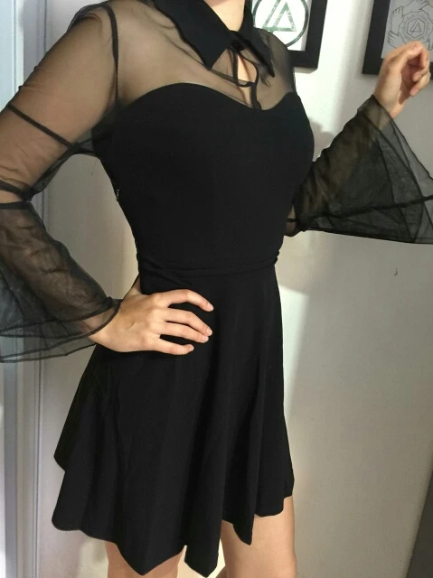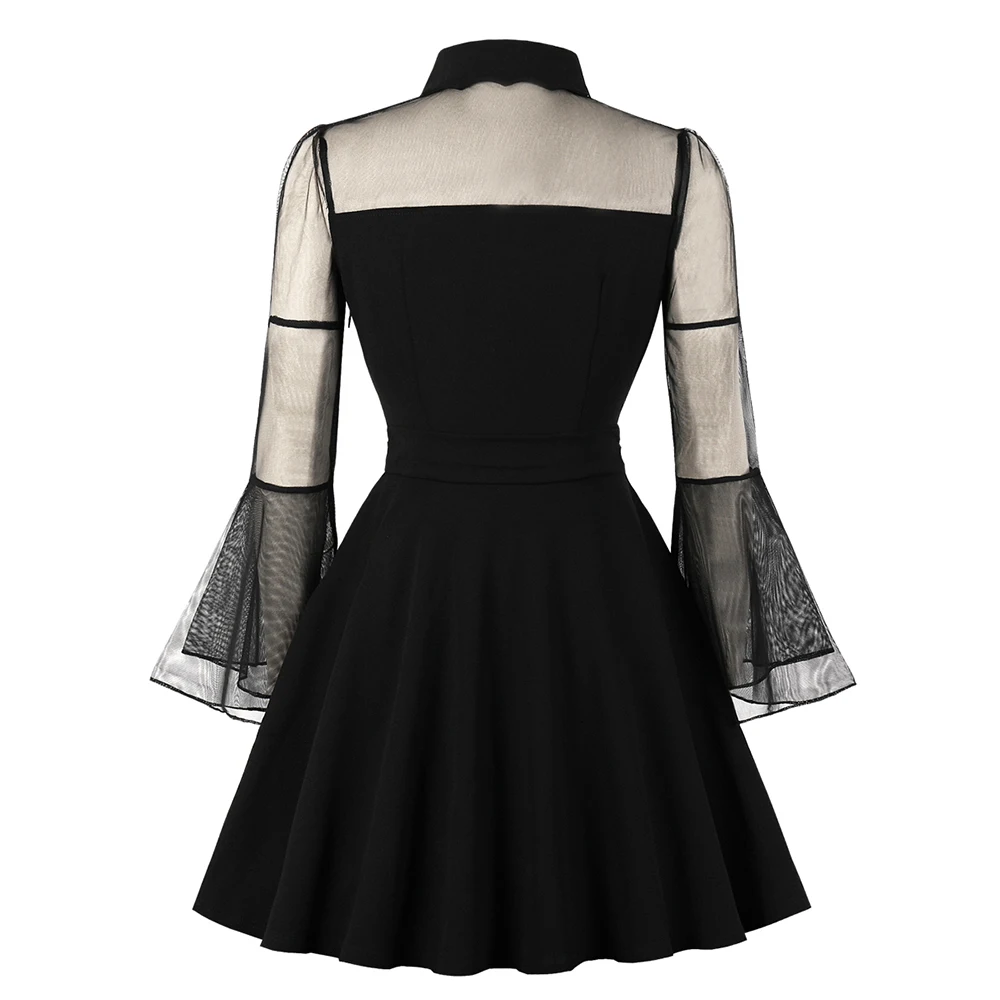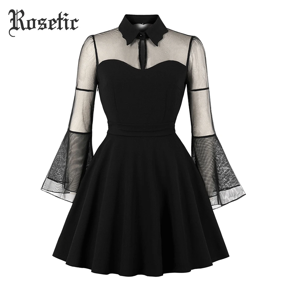 Special Offer Rosetic mujeres gótico Sexy Mini vestido negro malla Patchwork transparente manga de llamarada drapeado elegante Vestidos cortos de fiesta de talla grande Discount 51% Today!
