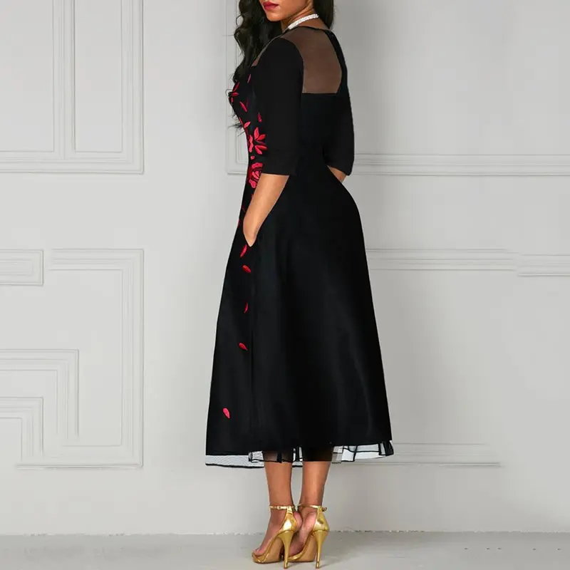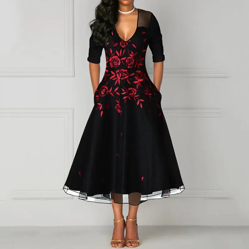 Special Offer Vestido de fiesta Sexy con estampado Floral elegante de malla transparente en V profundo negro de cintura alta de gran tamaño vestidos Vintage de verano para mujer Discount 52% Today!