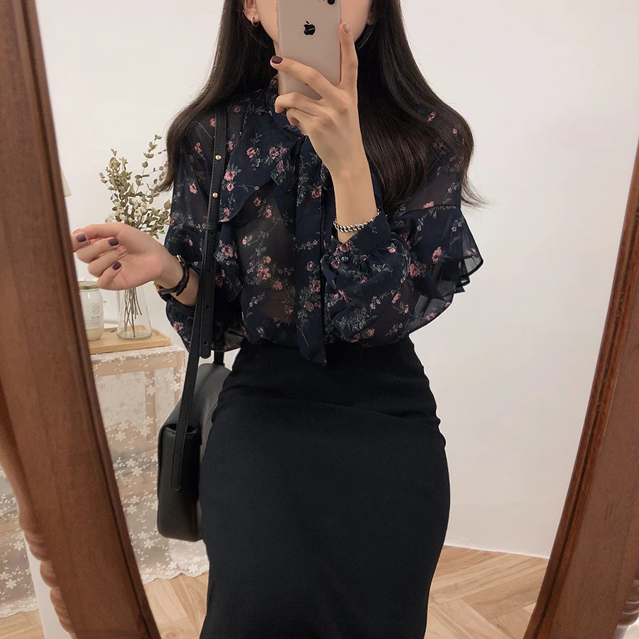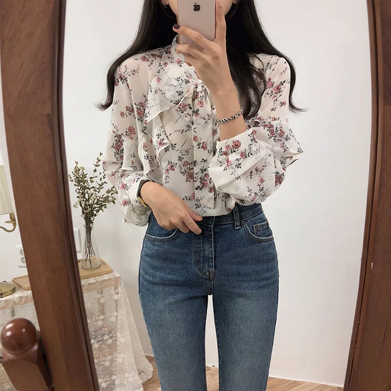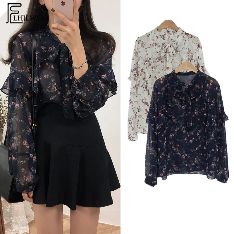 Special Offer 2019 blusas básicas de primavera para mujer estilo japonés Preppy lindas chicas dulces negro blanco Floral impreso con volantes pajarita camisa superior Discount 14% Today!