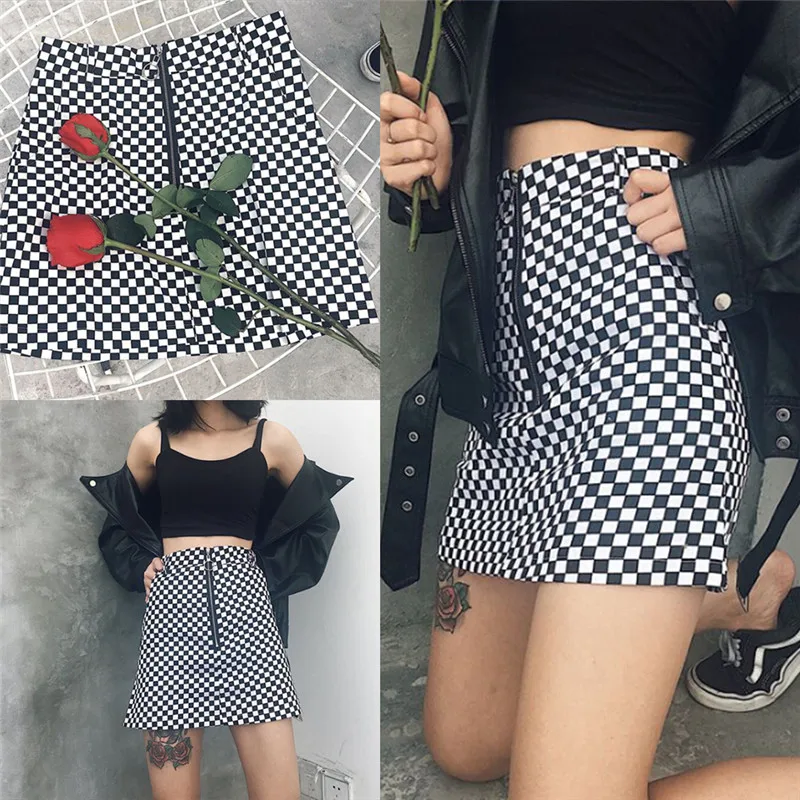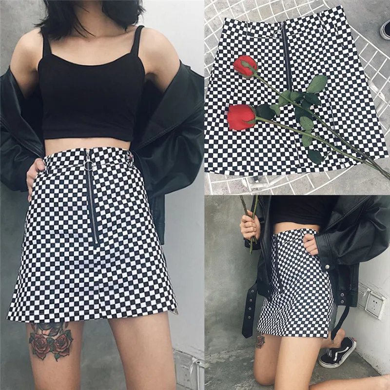 Special Offer 2018 nuevo Casual verano mujeres estilo japonés cremallera anillo Línea A de alta cintura Mini falda femenina negro blanco cuadros falda Discount 30% Today!