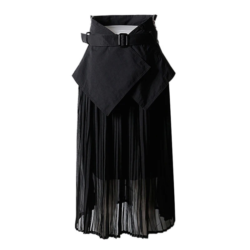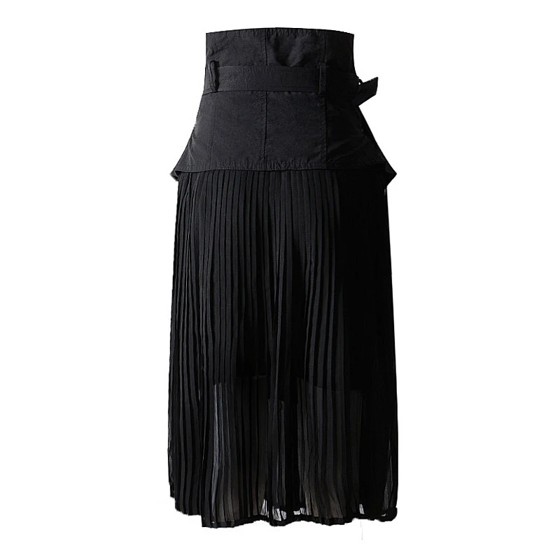 Special Offer [EAM] cintura alta malla empalmada cinturón plisado asimétrico medio cuerpo falda negro mujer moda marea nueva primavera otoño 2020 1A409 Discount 32% Today!