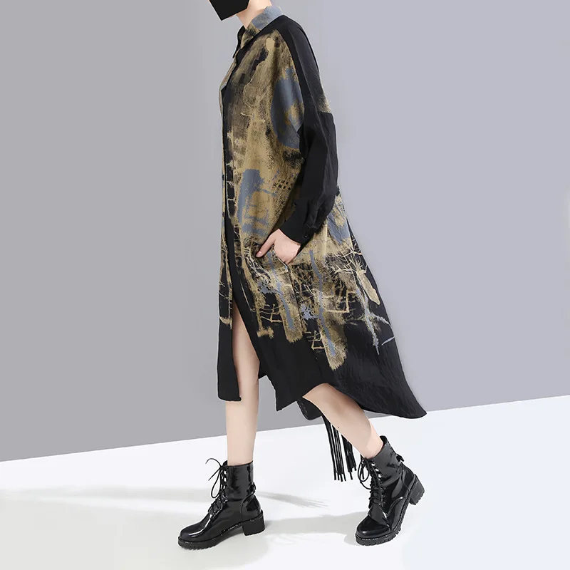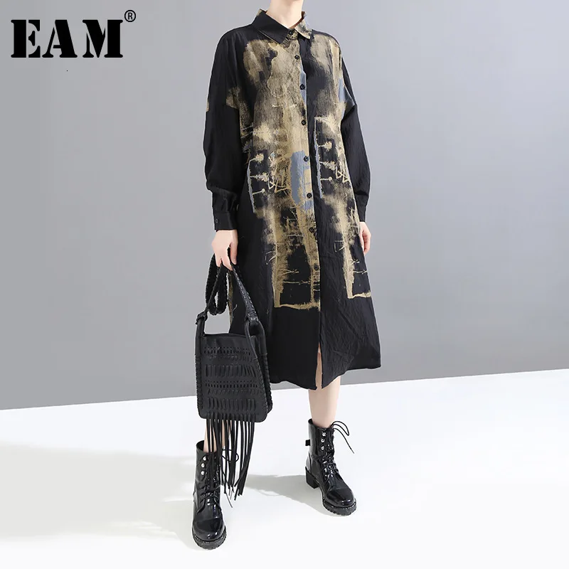 Special Offer [EAM] mujeres negro patrón negro estampado tamaño grande camisa vestido nueva solapa manga larga suelta ajuste moda marea principios de primavera 2020 1M925 Discount 32% Today!