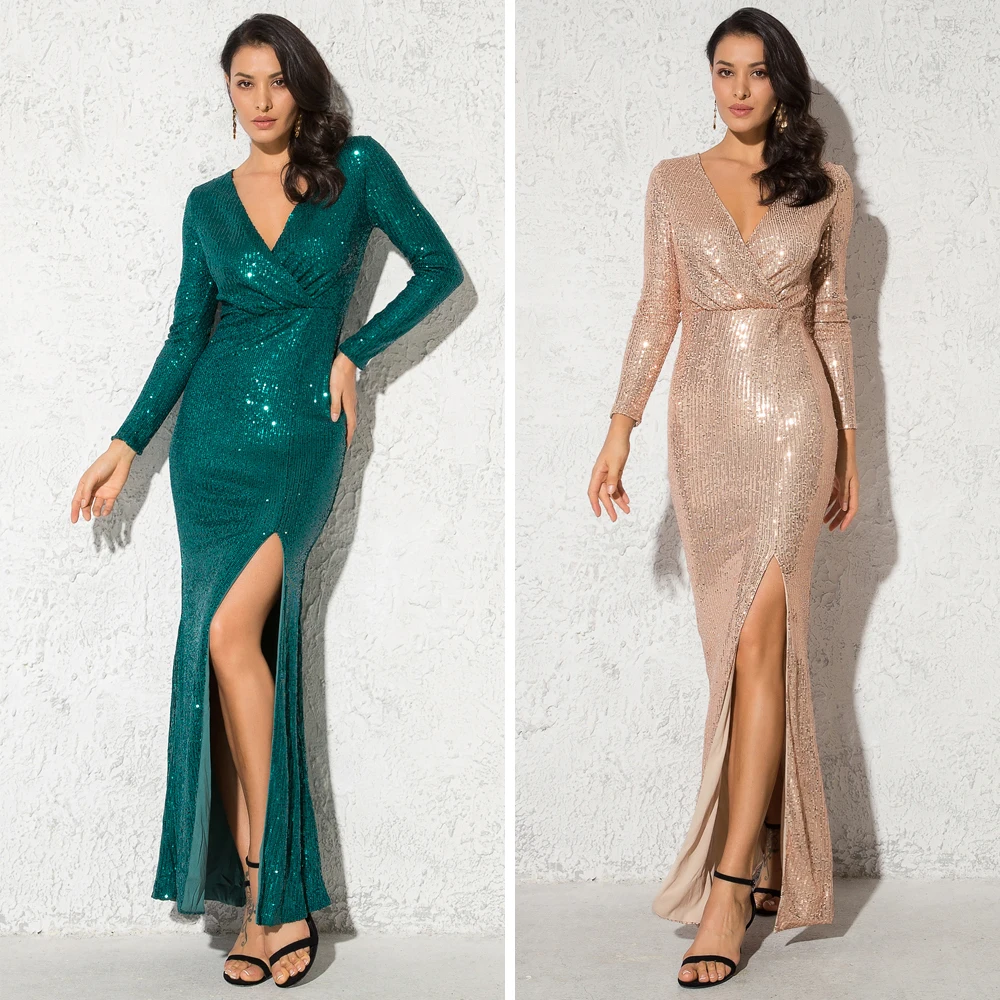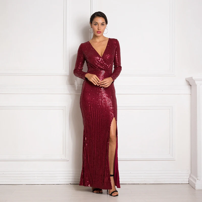 Special Offer Maxi vestido de lentejuelas de plata negro verde Borgoña cuello en V vestido de fiesta de noche vestido elástico de manga larga forro de pierna de hendidura baja Discount 35% Today!