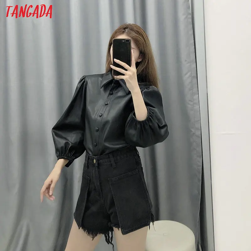Special Offer Tangada mujer faux leather black shirts 2019 nueva llegada linterna manga vintage mujer oversize blusas Blusas BE04 Discount 35% Today!