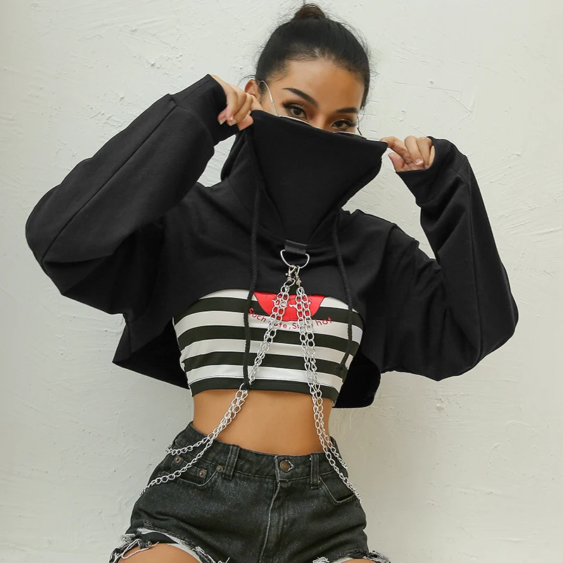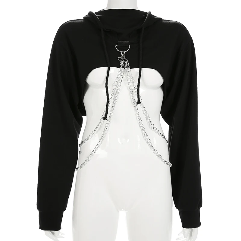 Special Offer Sweetown Punk de manga larga Crop superior sudaderas mujer otoño 2018 negro cuello alto cadena metálica Hip Hop Harajuku Sudadera con capucha Discount 42% Today!