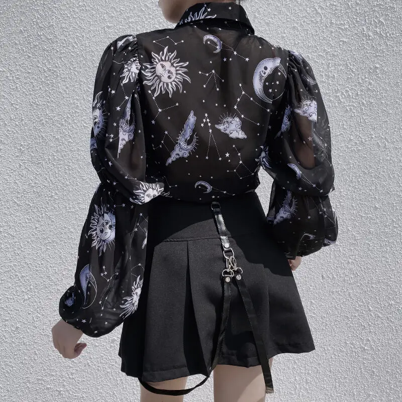Special Offer InsGoth mujeres Sexy transparente negro camiseta de gasa camisas góticas Streetwear Moon Son imprimir Puff manga larga Mujer suelta superior Discount 45% Today!