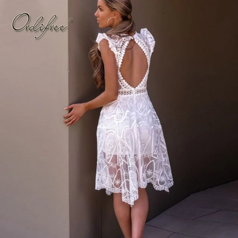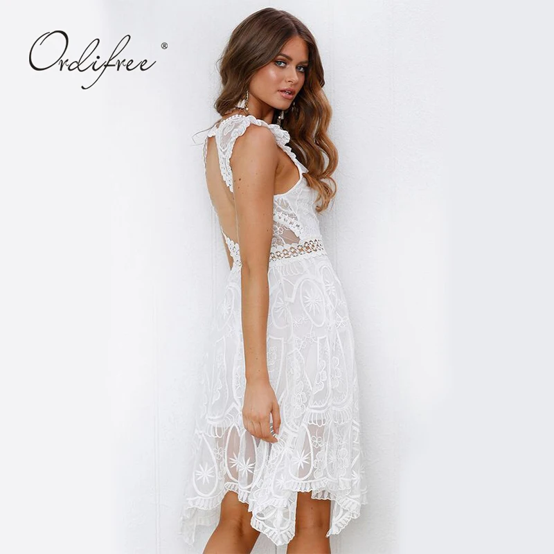 Special Offer Ordifree 2019 verano vestido sin mangas de encaje blanco sin espalda cuello en V transparente negro Sexy Vestido de playa bata Mujer Discount 45% Today!