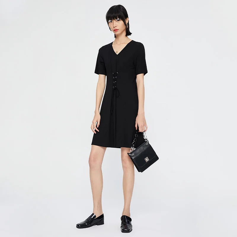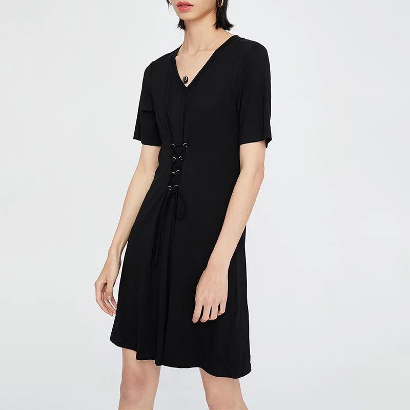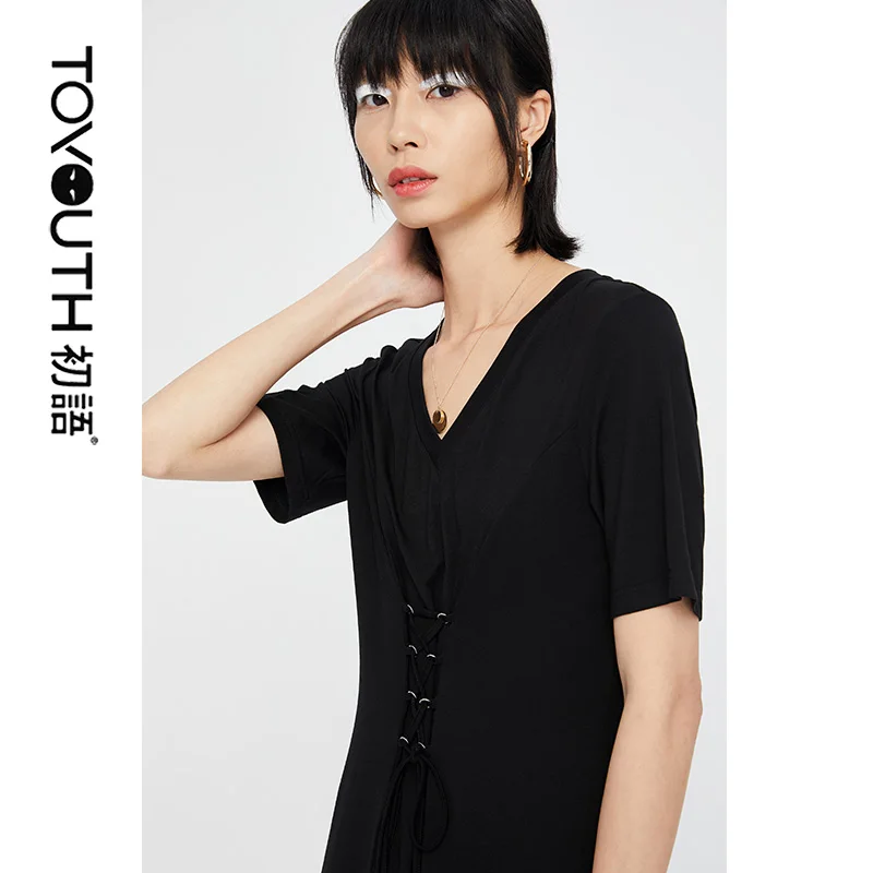 Special Offer Toyouth mujeres Vintage cuello en V encaje hasta alta cintura algodón Color sólido negro Mini vestido de manga corta vestidos Discount 54% Today!