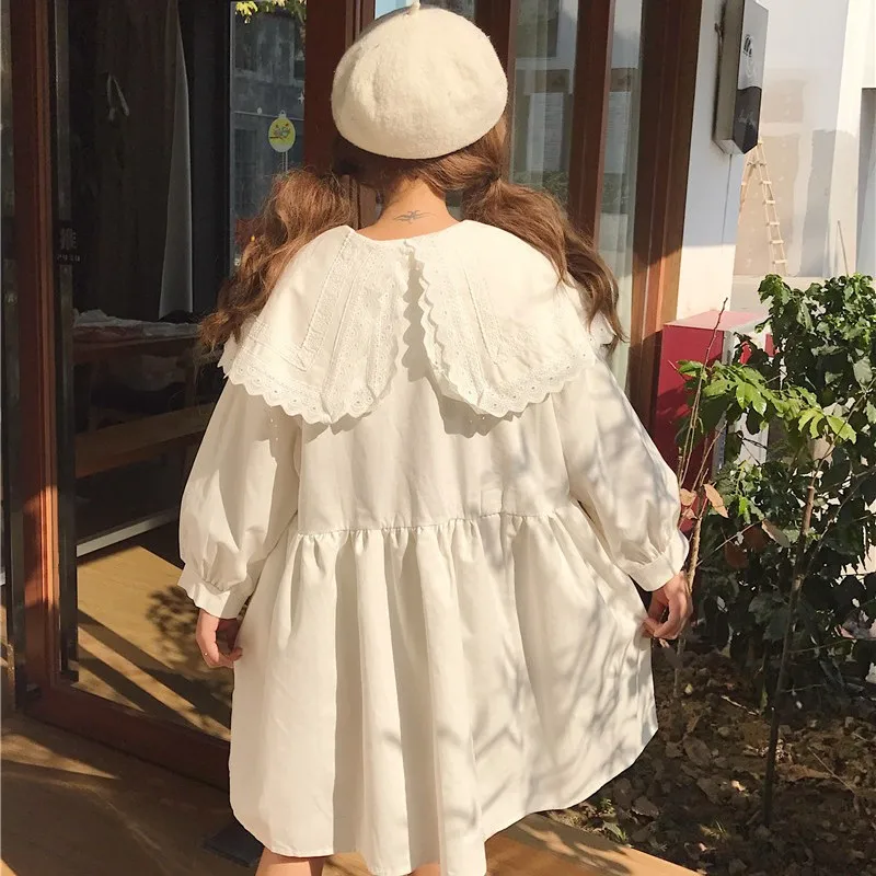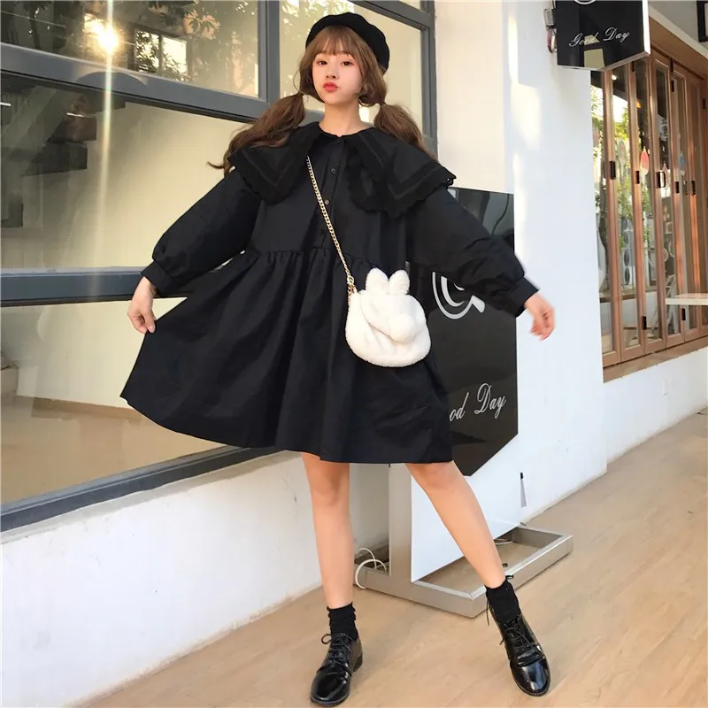 Special Offer Japonés Harajuku mujeres blanco negro vestido de doble capa de encaje cuello Anime Kawaii vestido Lolita estilo Mori chica Oversize lindo vestido Discount 30% Today!