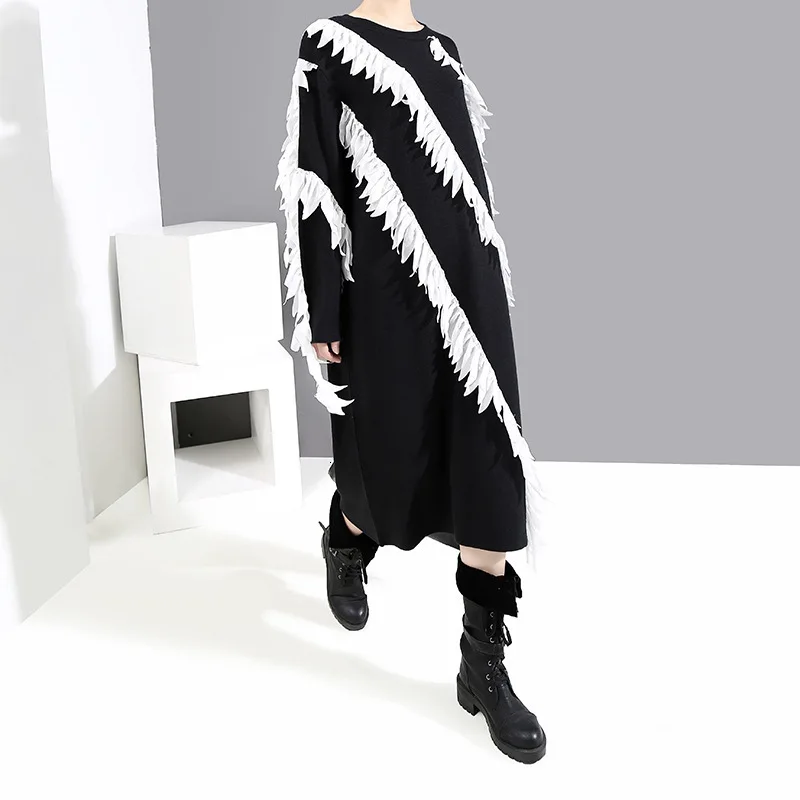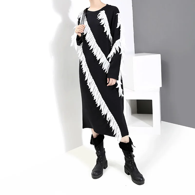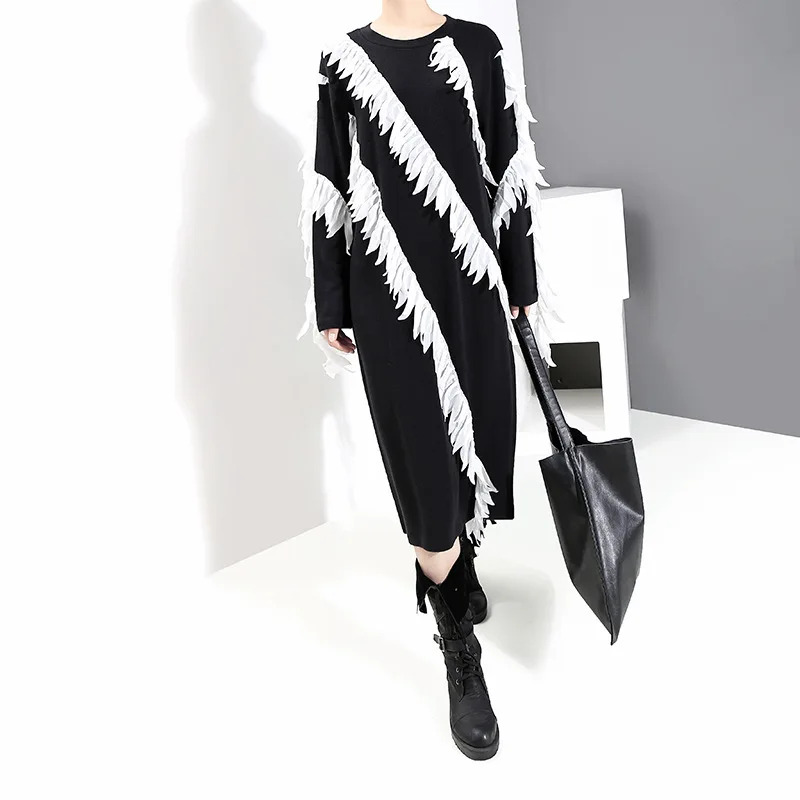Special Offer [EAM] vestido de temperamento con borlas de Color contraste para mujer nuevo cuello redondo manga larga ajuste suelto moda Primavera otoño 2020 19A a157 Discount 32% Today!