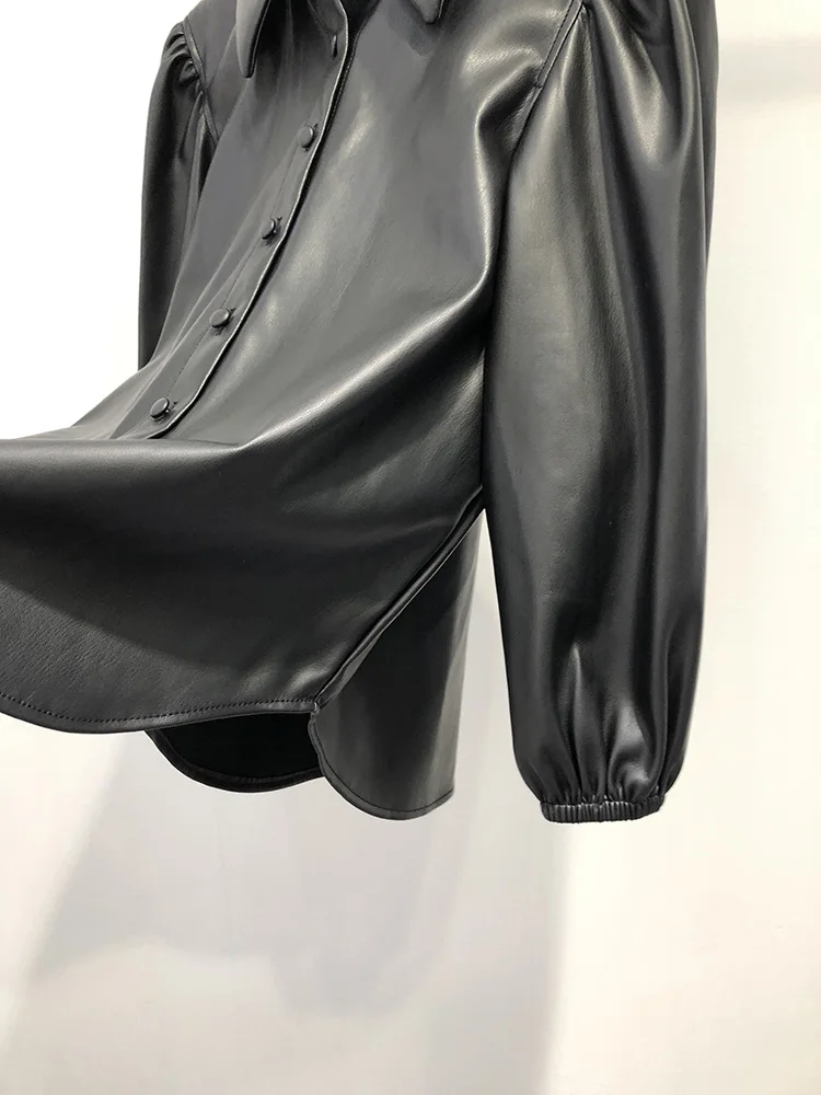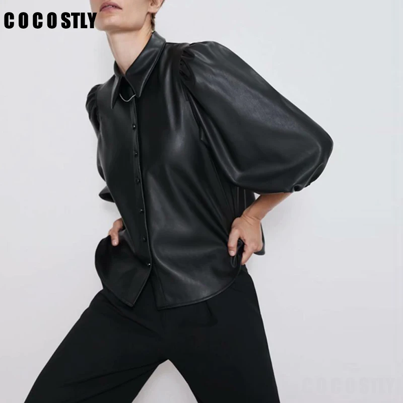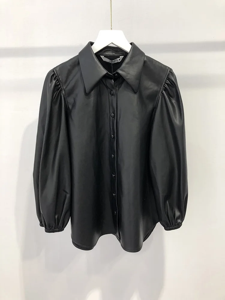 Special Offer 2019 otoño nuevo Puff blusa manga corta Mujer moda botón sólido imitación cuero camisas señoras Casual negro Tops mujer Blusas Discount 35% Today!