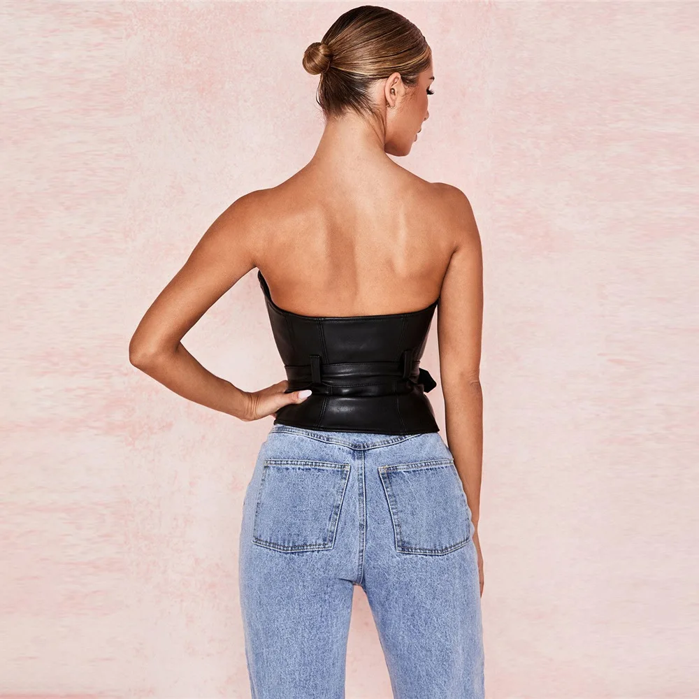 Special Offer Camisetas recortadas de cuero de PU sin tirantes con cremallera en la parte delantera para mujer 2019 otoño Sexy ropa de fiesta negra Streetwear Discount 40% Today!