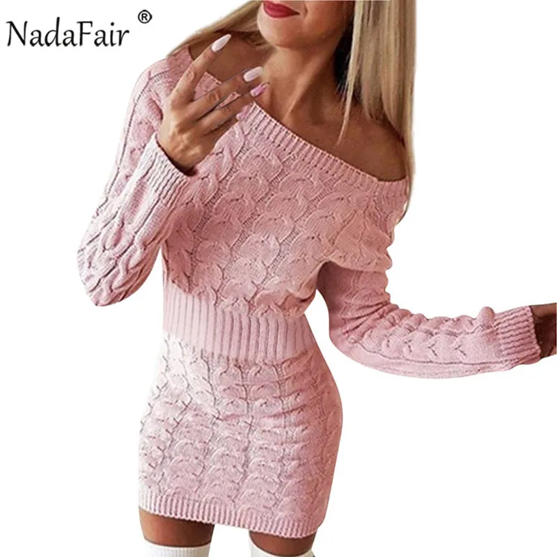 Special Offer Nadafair suéter vestido mujer otoño Mini manga larga elegante Rosa blanco negro tejido ceñido vestido de invierno Vestidos de mujer Discount 42% Today!