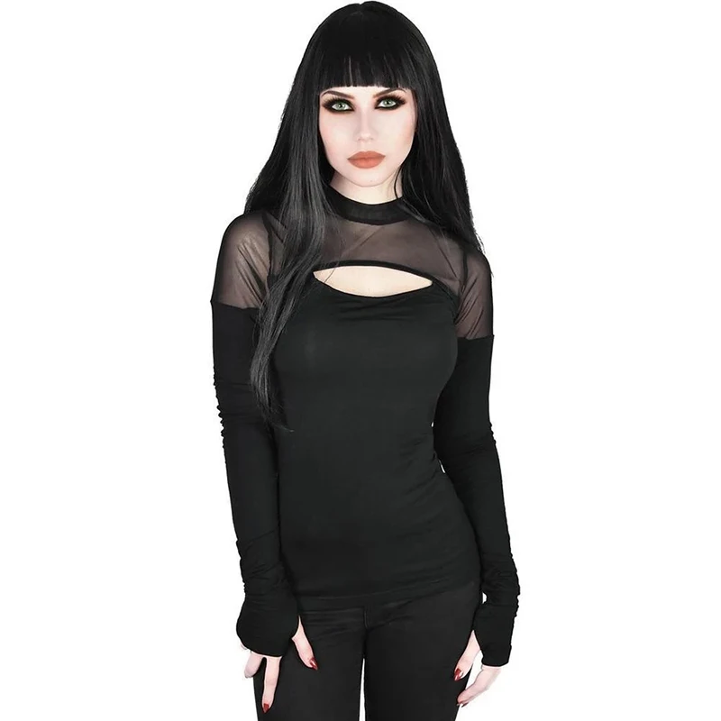Special Offer Camisetas de malla ajustadas negras para mujer sexis de estilo gótico Punk con retazos ahuecadas de manga larga para mujer camiseta de Streetwear Discount 45% Today!