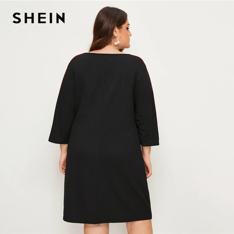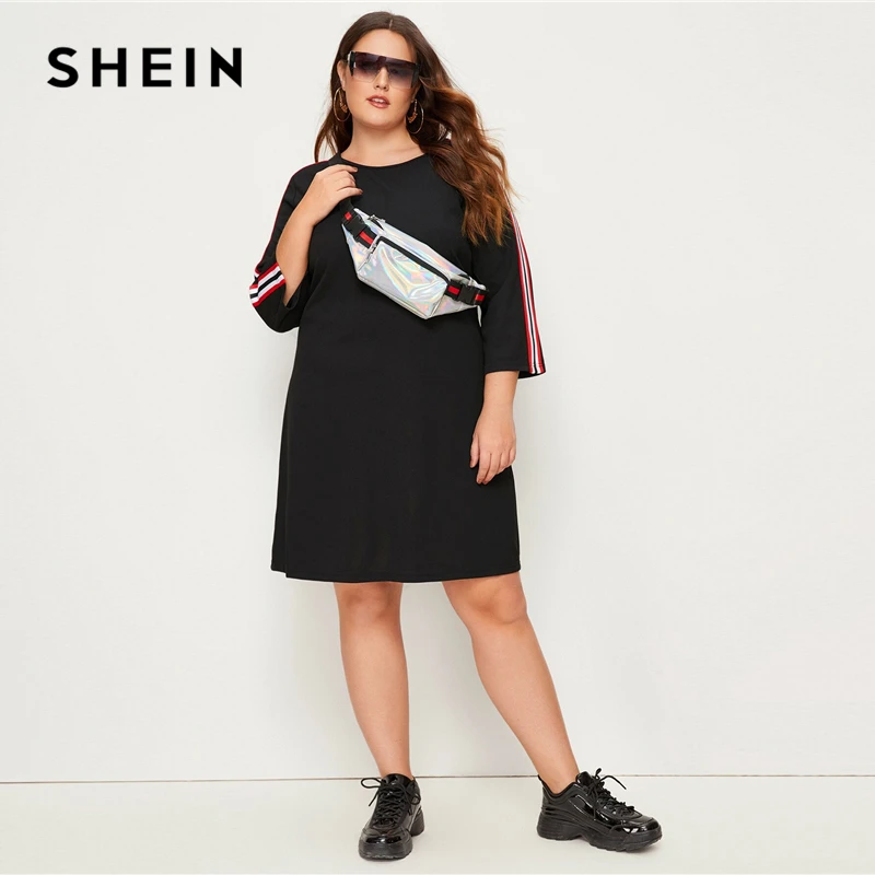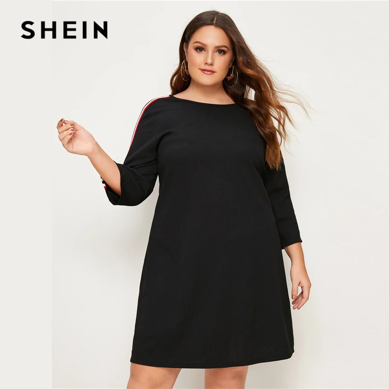 Special Offer SHEIN Plus Size Plus negro rayado cinta detalle Vestido Mujer verano otoño 3 4 manga larga Plus Casual Vestidos cortos rectos Discount 46% Today!