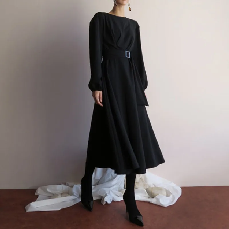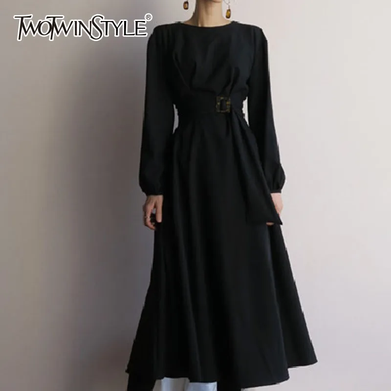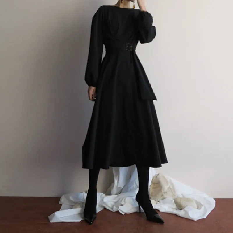 Special Offer GALCAUR coreano negro vestidos femeninos de alta cintura linterna manga larga vendaje Midi vestido para mujeres 2019 otoño moda nueva Discount 49% Today!