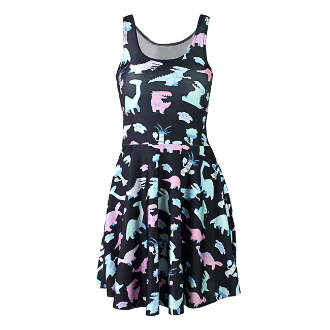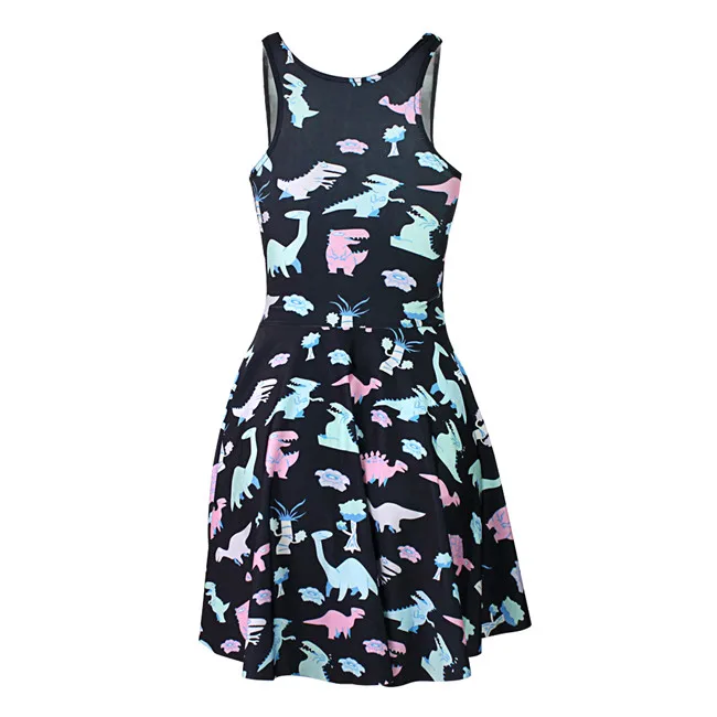 Special Offer 3 patrones de dibujos animados dinosaurio estampado sin mangas mujeres verano negro vestido multicolor dinosaurio 3D estampado plisado vestidos S a 4xL Discount 0% Today!