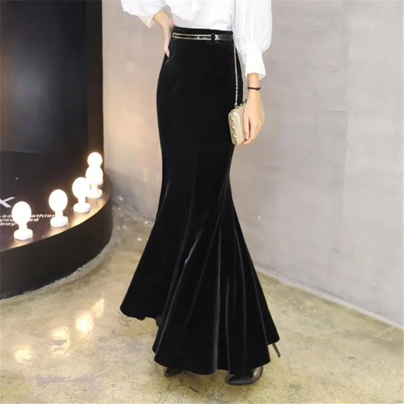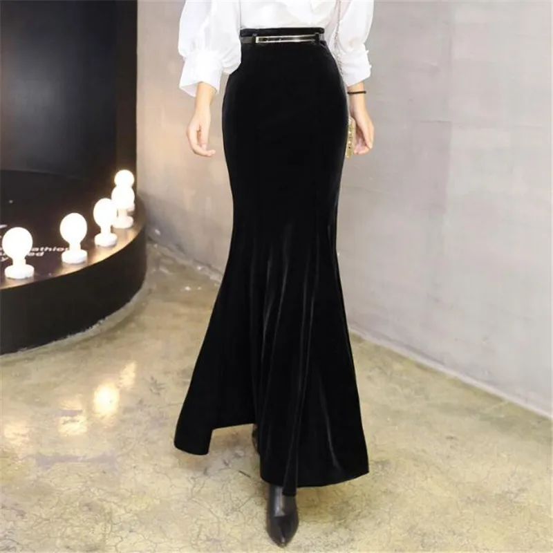 Special Offer Faldas de sirena de terciopelo para mujer de talla grande 5XL Falda larga de invierno con cinturón otoño femenino elegante falda Maxi de terciopelo negro Ds50163 Discount 15% Today!
