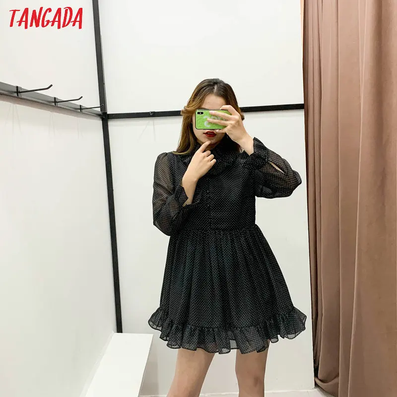 Special Offer Mini vestido de fiesta femenino casual vintage manga larga con volantes con estampado de puntos negros Tangada para mujer 6P72 Discount 30% Today!
