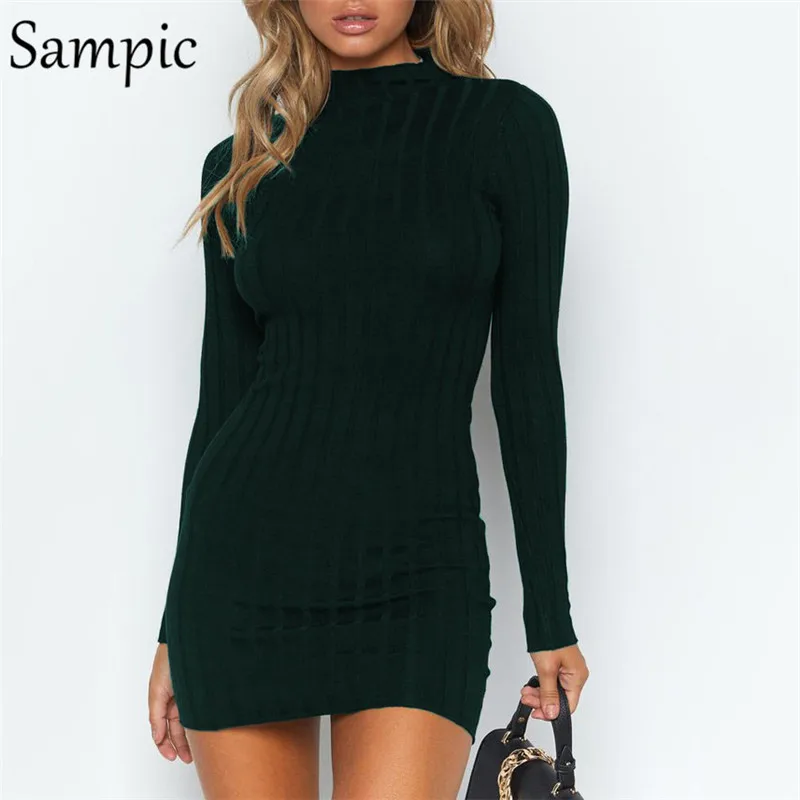 Special Offer Sampic manga larga tejido Bodycon mujer vestido cuello tortuga Vintage elegante otoño Vestidos cortos negro moda mujer Mini vestido Discount 30% Today!