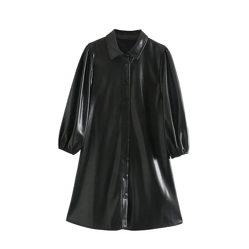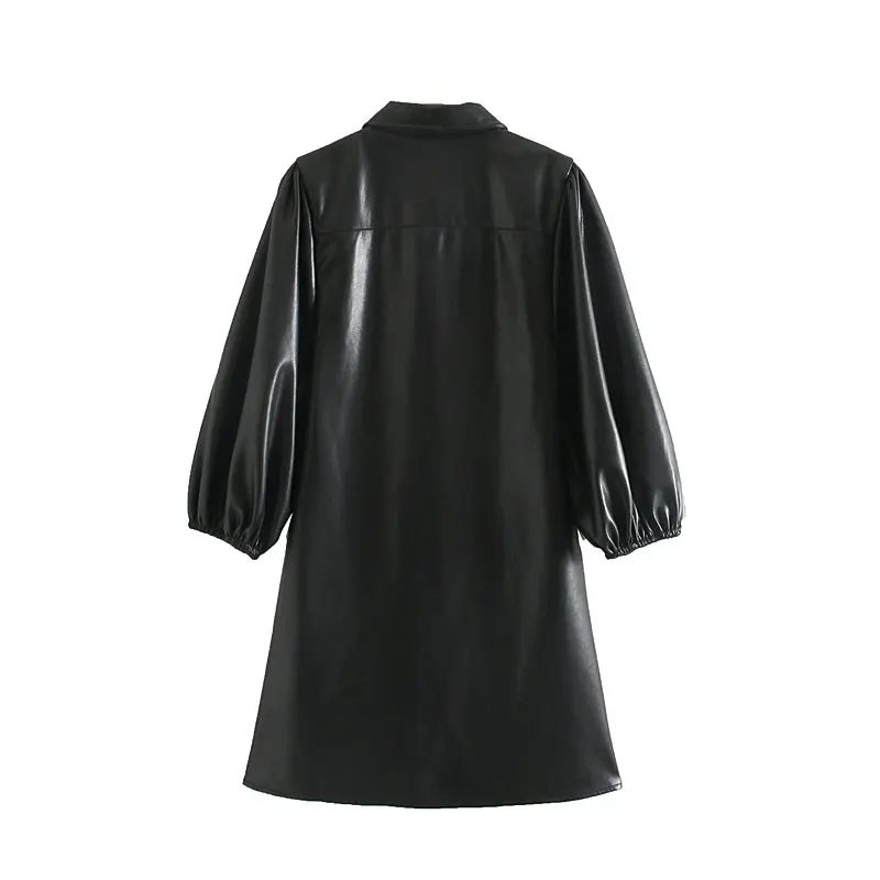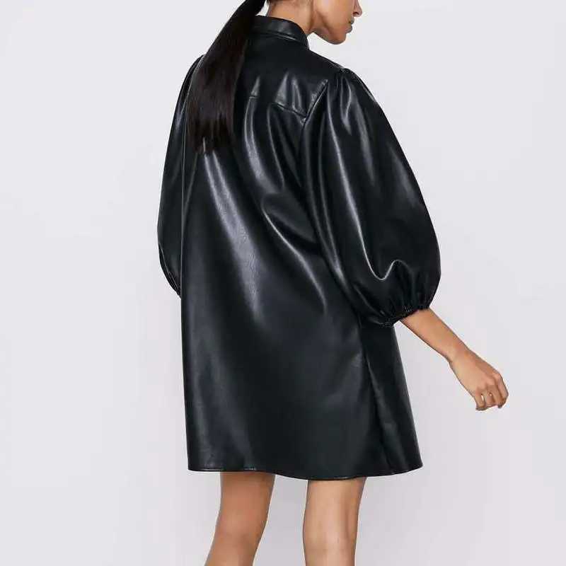 Special Offer 2020 nueva moda mujer Otoño Invierno negro PU cuero vestidos damas manga corta cuello vuelto elegante Mini vestido Discount 41% Today!