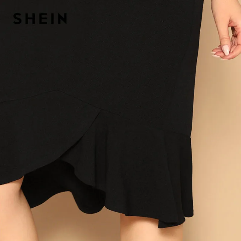 Special Offer SHEIN de talla grande volantes asimétricos dobladillo negro ajustado falda Oficina señora elegante sólido hasta la rodilla FIN DE SEMANA Casual faldas lápiz Discount 41% Today!