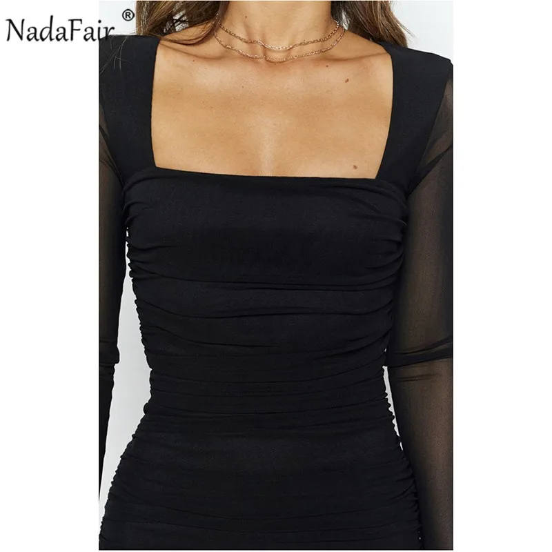 Special Offer Nadafair cuello cuadrado negro mujeres Sexy vestido de malla otoño manga larga fruncido transparente fiesta Mini vestido ajustado invierno Discount 45% Today!