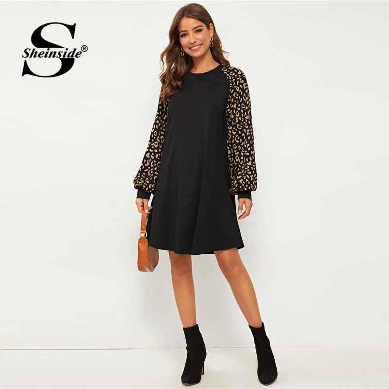 Special Offer Sheinterior Casual patchwork con estampado de leopardo Vestido Mujer 2020 linterna de muelle manga vestidos rectos señoras negro Midi vestido Discount 45% Today!