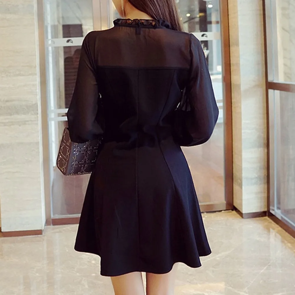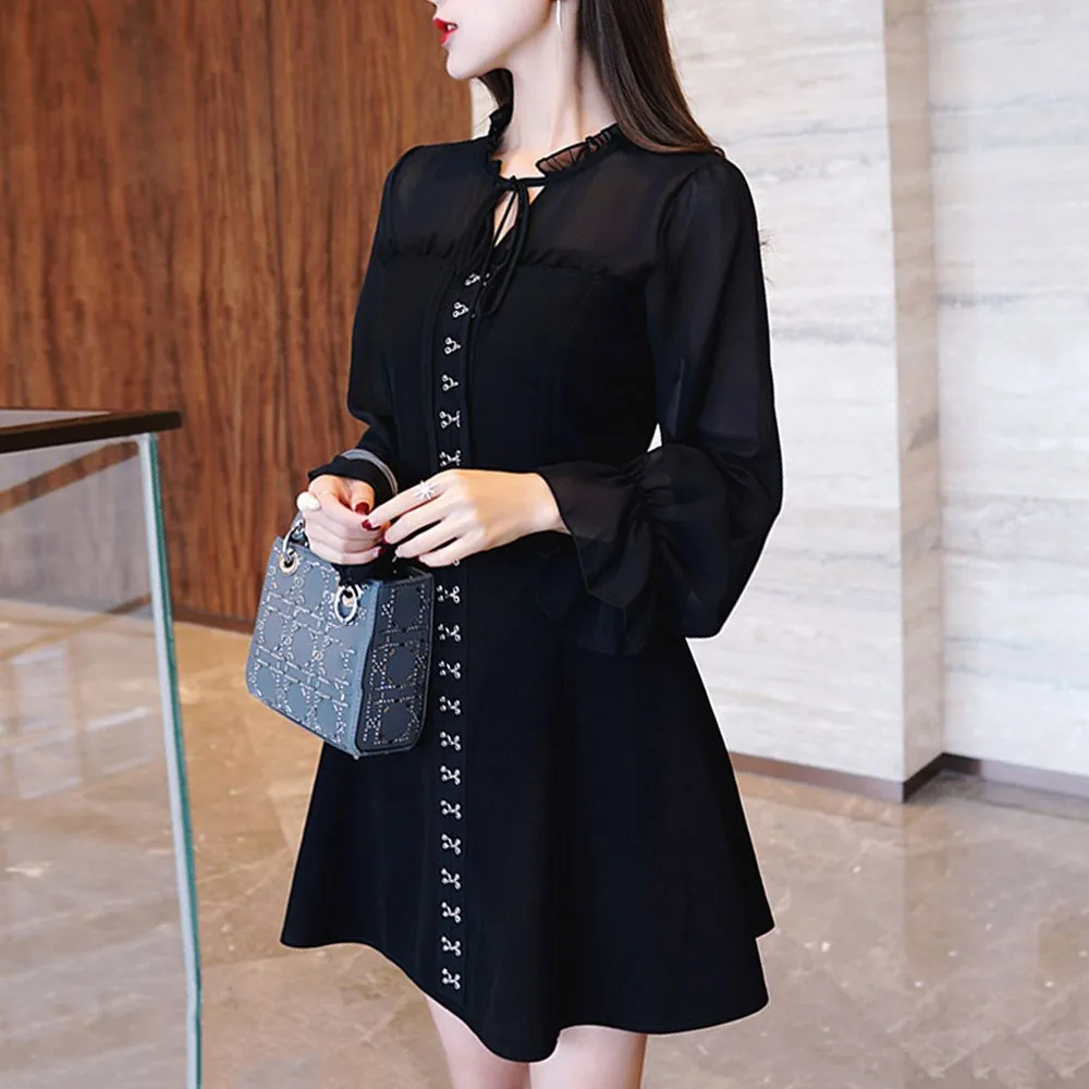 Special Offer Moda mujer negro Vintage elegante Oficina dama fecha Noche Vestidos 2019 otoño A Line encaje Up chicas fresco liso vestido femenino Discount 49% Today!