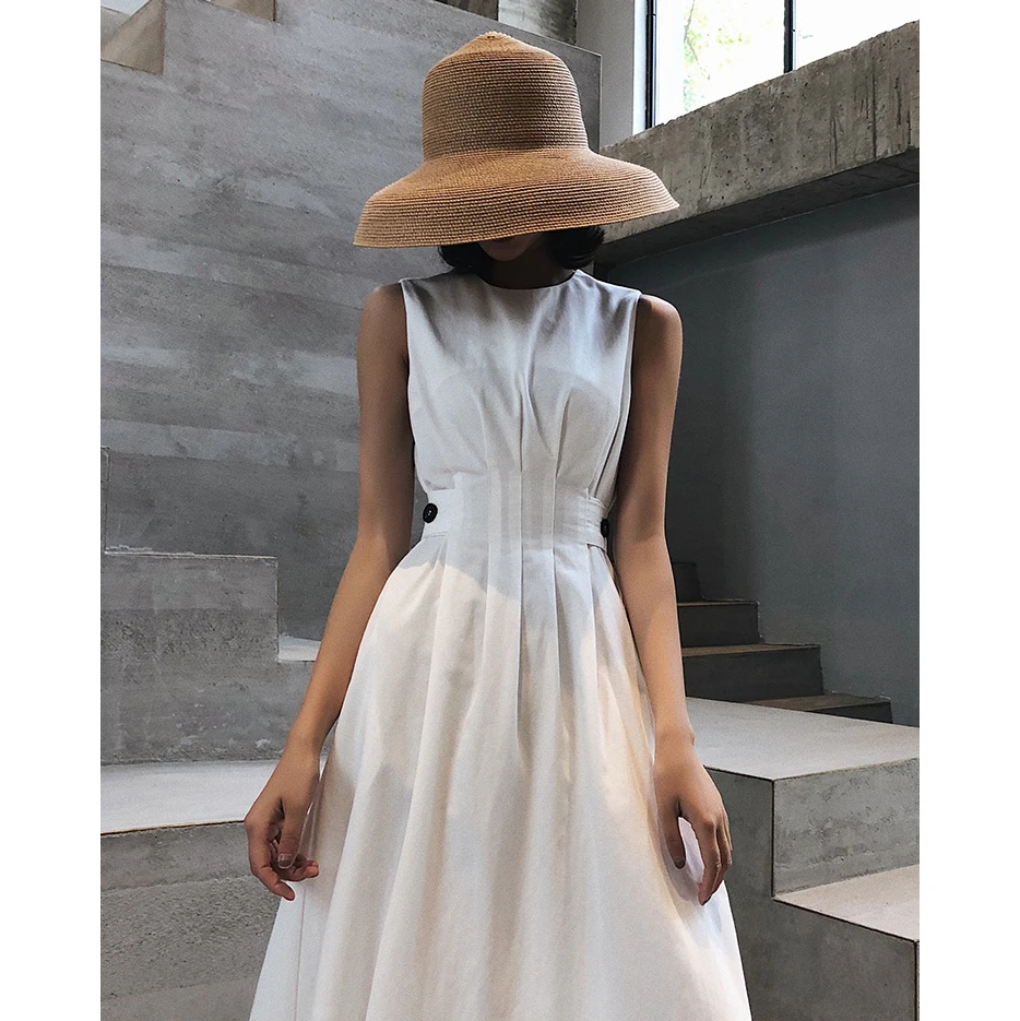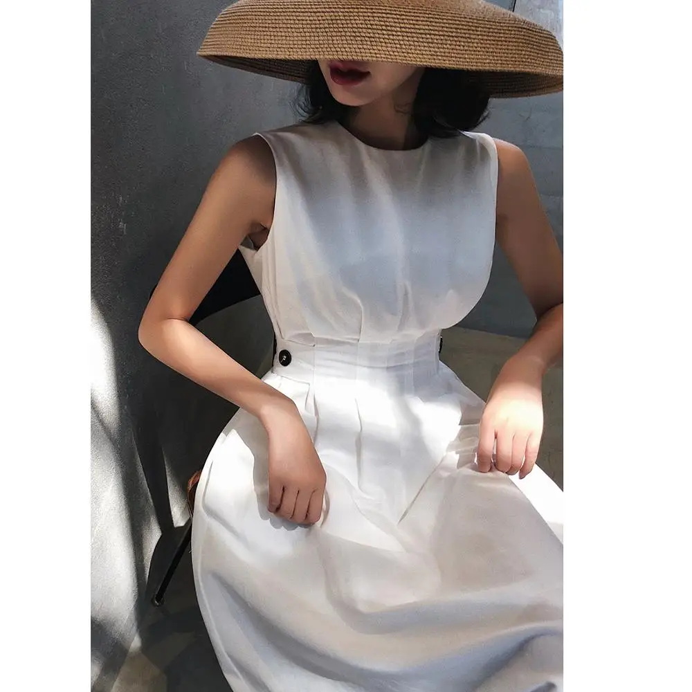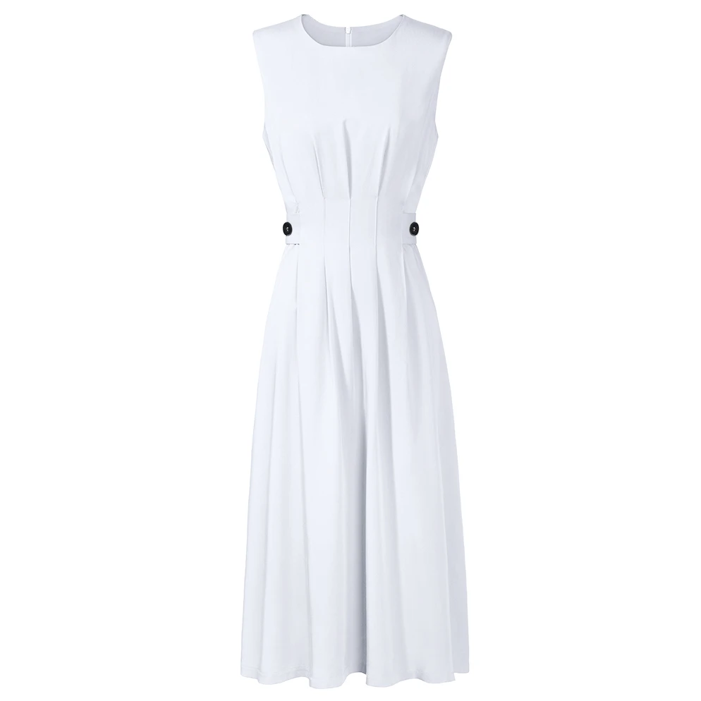 Special Offer Vintage mujer moda vestido Color sólido negro blanco sin mangas doblar elegante vestido de fiesta de noche Casual Ofiice Lady Midi vestidos Discount 5% Today!