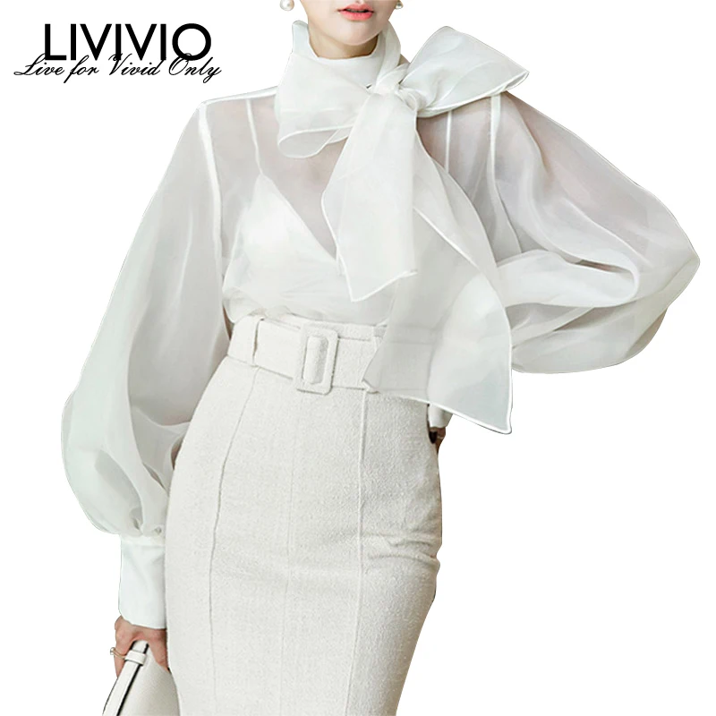 Special Offer [Livio] 2019 verano manga larga linterna arco blanco pura blusa mujer camisa negra Oficina señoras blusas ropa de moda coreana Discount 45% Today!