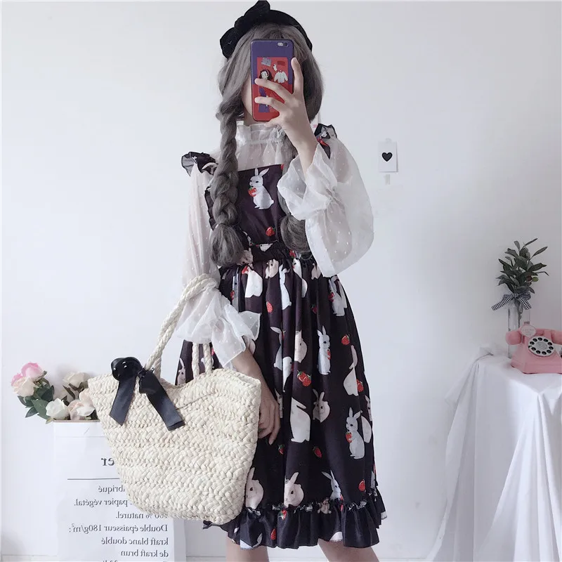 Special Offer Mujeres dulce Lolita dess Girl lindo conejo vestido negro fresa con volantes vestido de burbuja Puff princesa vestido puntos Camisa de gasa Discount 13% Today!