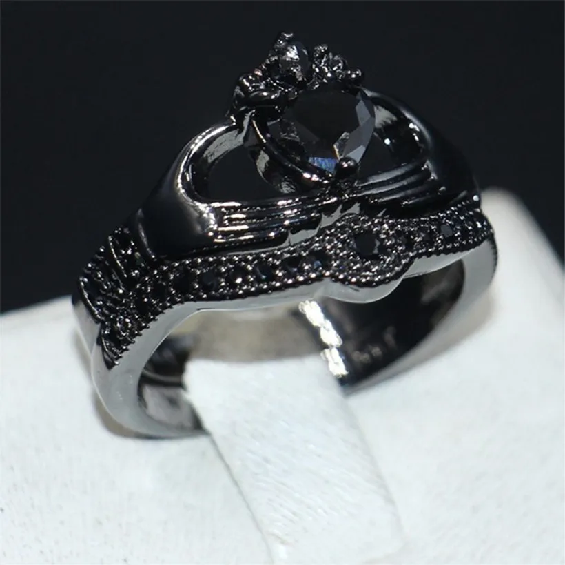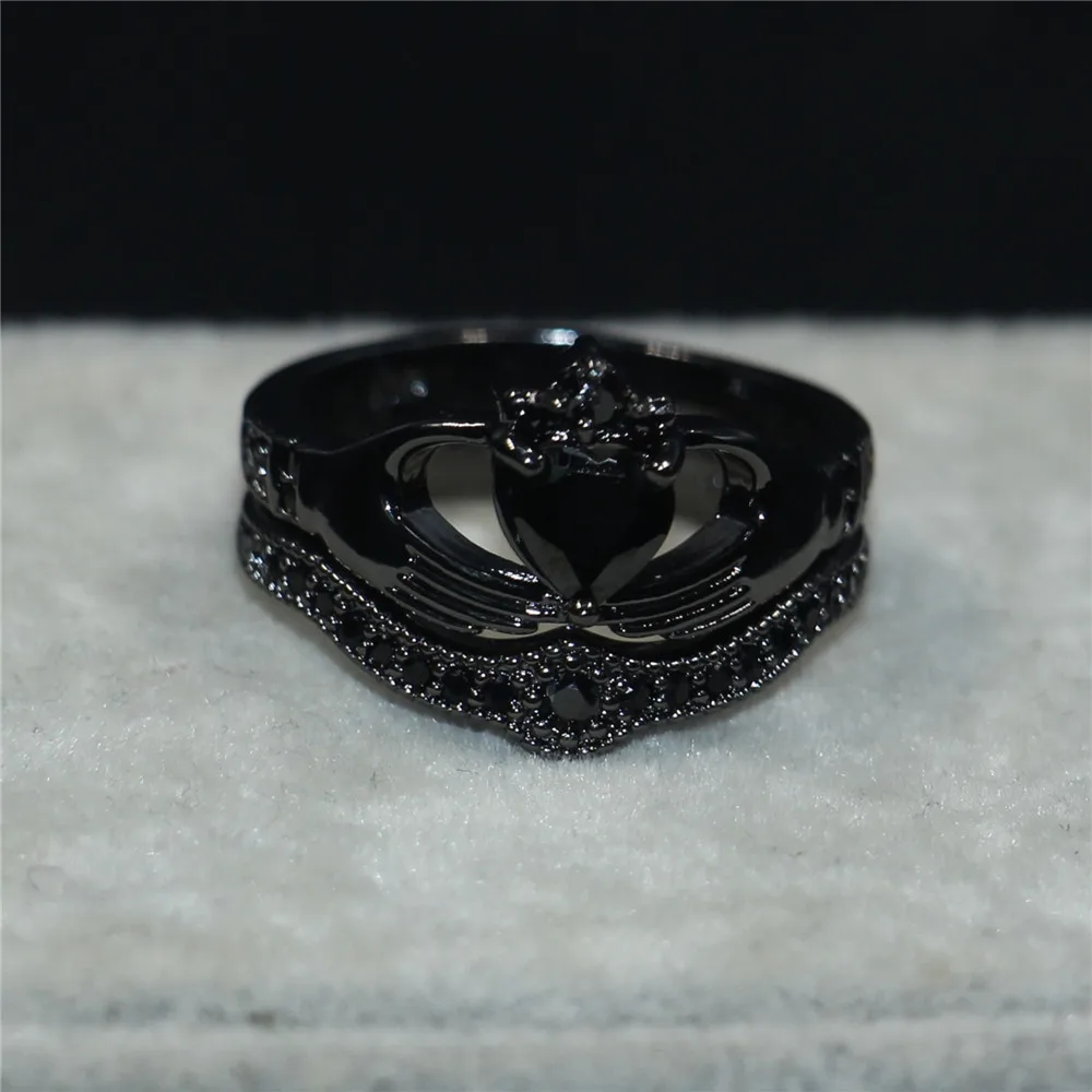 Special Offer Conjunto de anillo de boda de corona de circonita negra con corazón de amor Choucong Claddagh con corazón de amor y corona de cristal blanco lleno de oro negro de 10KT Discount 14% Today!