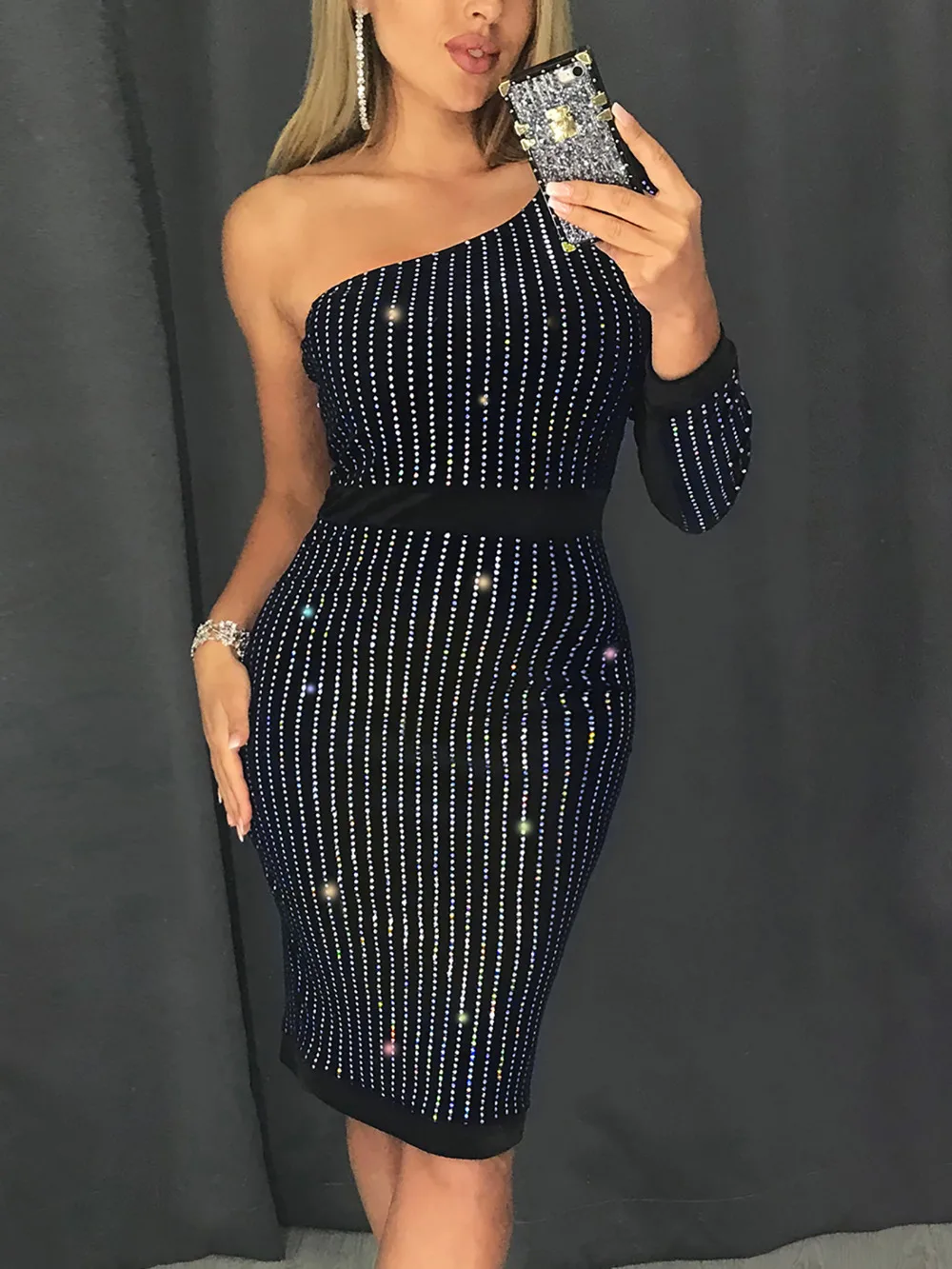 Special Offer Vestido elegante con un solo hombro brillante para mujer vestido Sexy negro brillante de cóctel vestido de fiesta Midi con detalle de tachuelas vestidos ajustados Discount 25% Today!