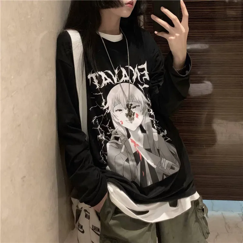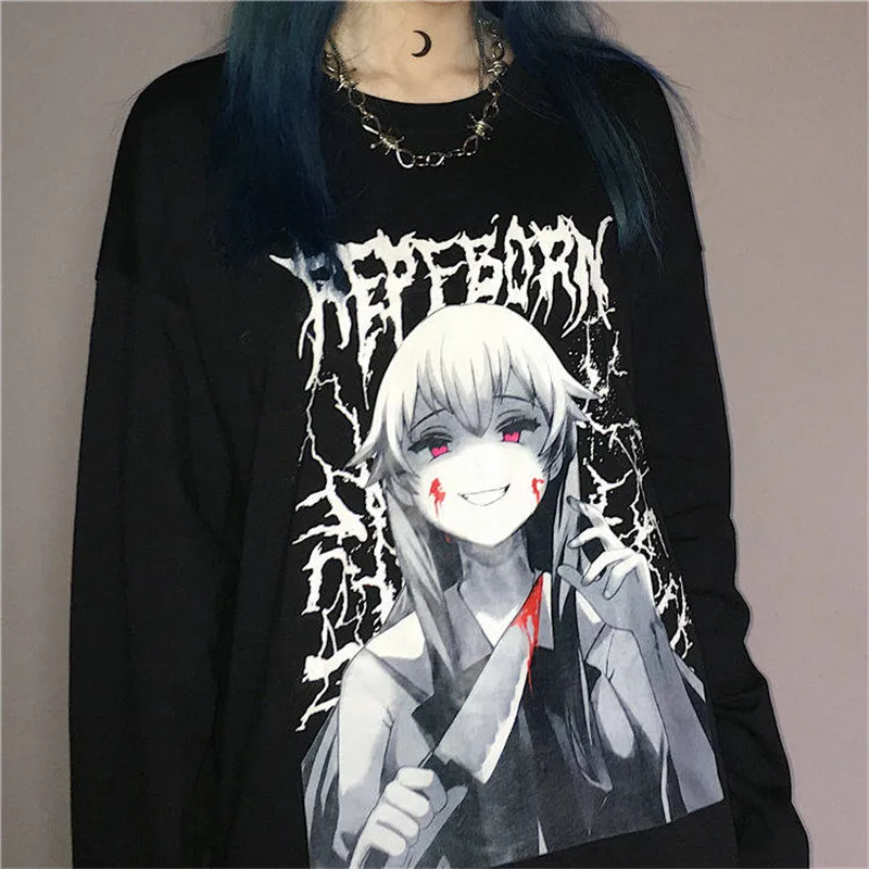 Special Offer Gótico Punk mujeres negro camisetas otoño mujeres tapas Harajuku Cool Japón camiseta femenina otoño manga larga Camisetas pulóver Discount 30% Today!