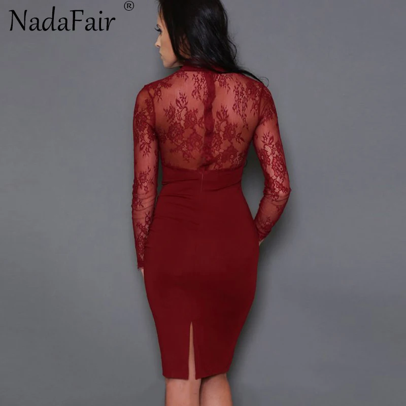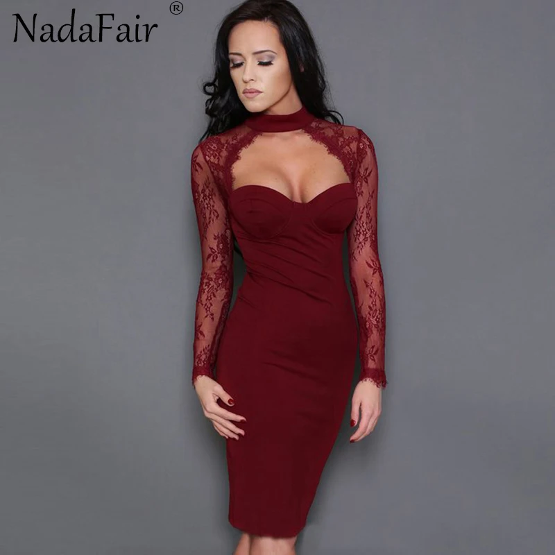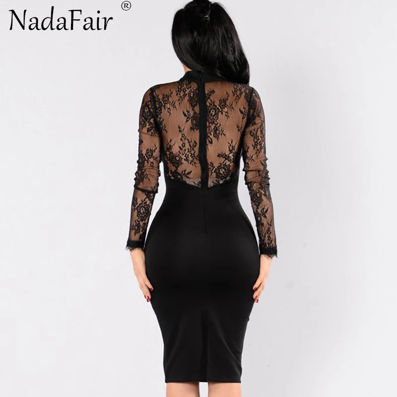 Special Offer Nadafair Lace Sexy ceñido al cuerpo Club vestido de fiesta mujeres de manga larga de corte bajo de encaje transparente a través de Midi vestido de verano Vestidos negro Discount 30% Today!